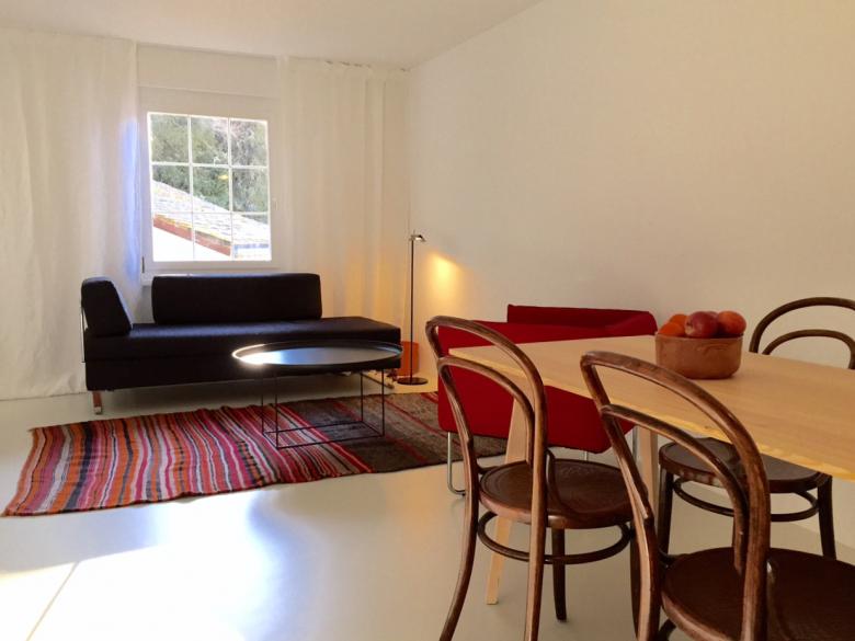 Durch das Öffnen der kleinen, fensterlosen Küche zum Wohn-/Essraum und durch die Materialwahl konnte eine helle heitere Stimmung erzeugt werden.