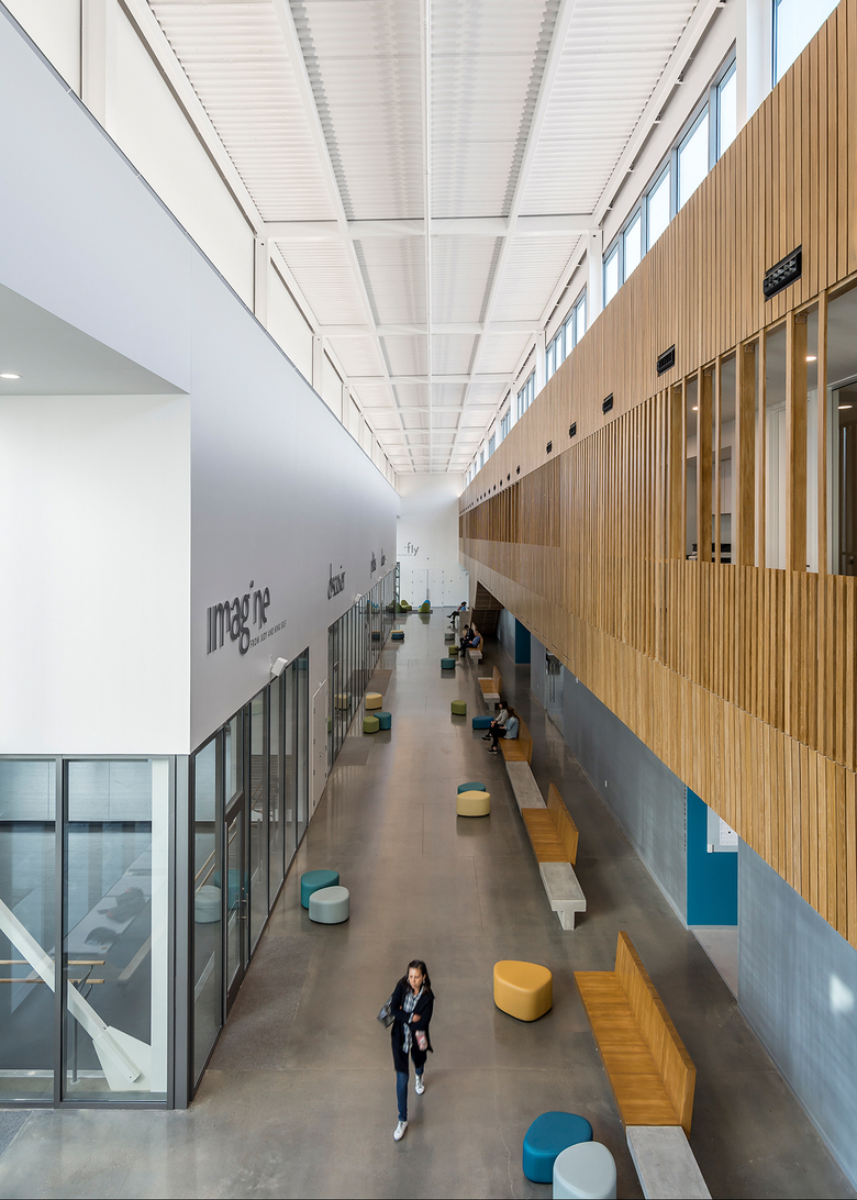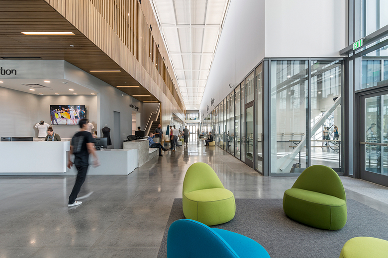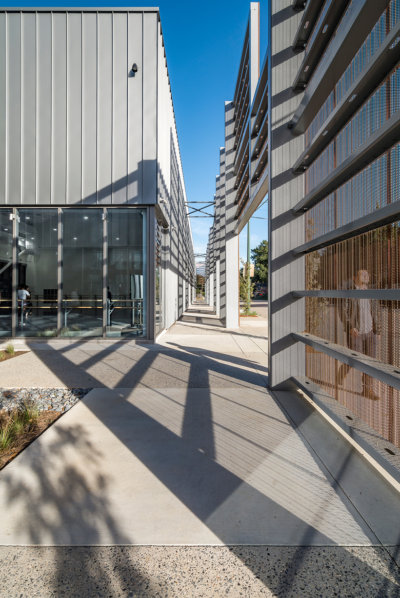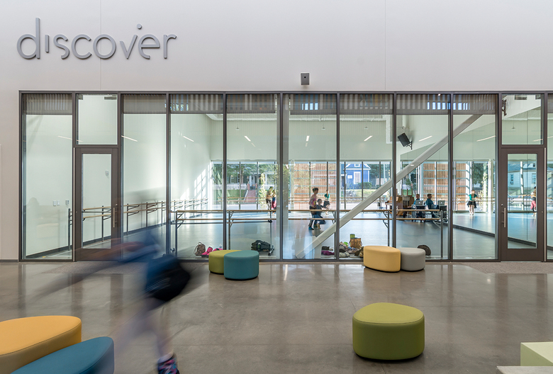 The courtyard spaces offer opportunities for the community to engage with the school, and also break the scale of the large building down to suit the context. The exterior form, composed of layers of glass, perforated copper, and volumes of contrasting metal evokes the character of a music box. Gauzy screens and courtyards that penetrate the building mass both mask and reveal the activity of dancers within. Warm and neutral materials alongside cool colors are also used to frame and display activity and the dancers.
