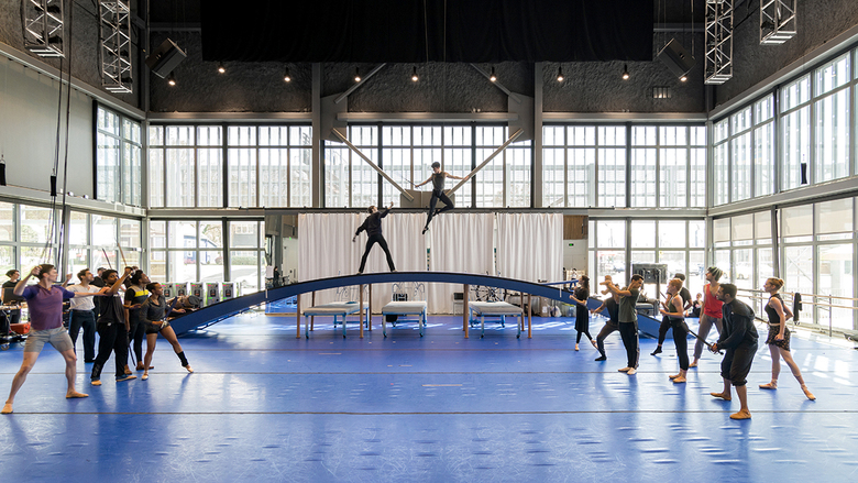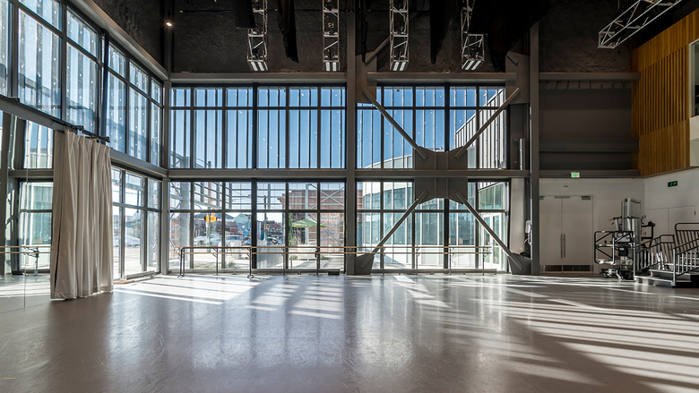 The new, civic-oriented facility is an extension of the Company’s mission. With large windows and public courtyards, the building contributes to the already thriving urban district. Formerly a hotel with parking in the front, the new site design inverts the original scheme. The building is designed to engage the public in movement, culture, and connection to the community. It houses rehearsal space for the professional company, a dance school for over 200 children, and community dance and pilates classes. The largest rehearsal studio also doubles as a performance venue.