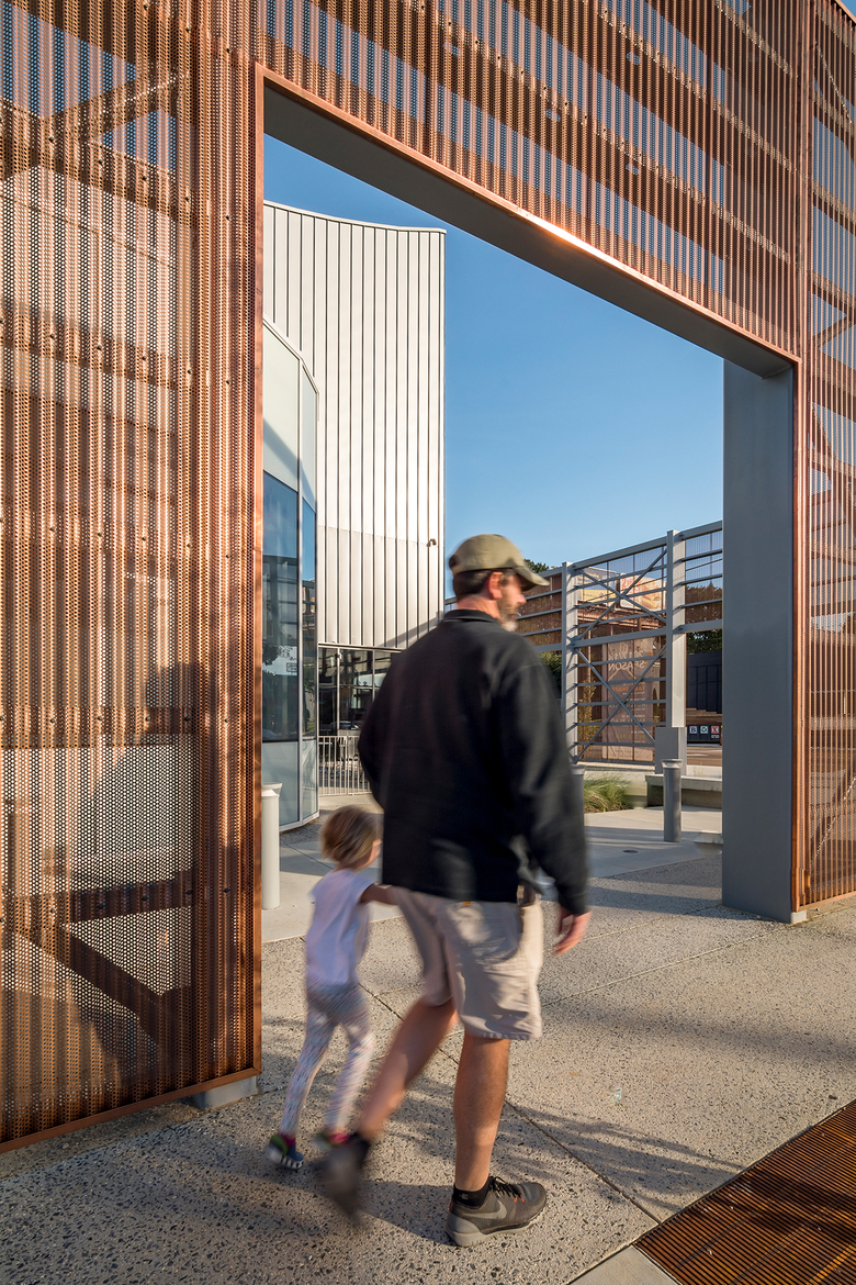 The copper screen sits at the historic street edge—enhancing the urban experience within an entertainment district—while complying with current city codes and setbacks. The building’s façade offers opportunities for the community to participate in the organization, via exterior courtyards, retail experiences, and a café, and a costume shop featuring a display window/mini-performance place.