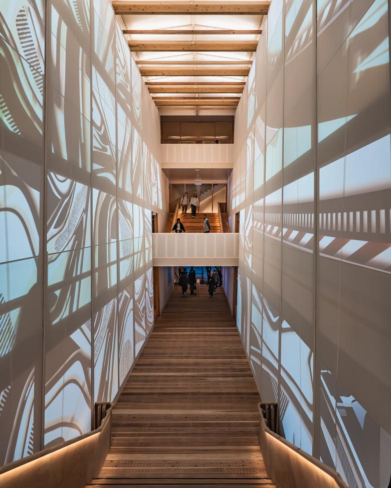 The 4th story atrium, enveloped by a mesh membrane, softly reflects and diffuses daylight and indirect light. The ceiling membrane, illuminated by high-power linear lighting installed above the top beams, delivers softened light down to the ground floor, offering visitors comfort as if embraced by the “Mother Sea” or within a mother’s womb.