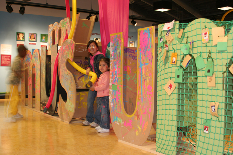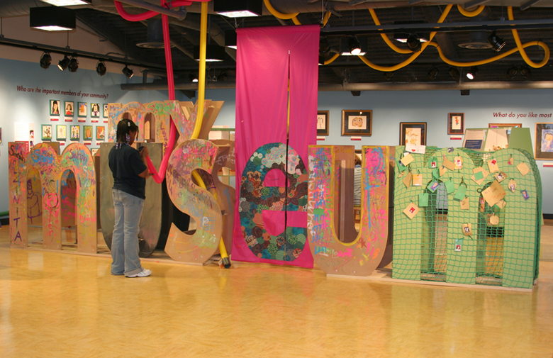 My Museum is designed to create hands-on opportunities for personal and intrapersonal expression and exploration. The body-scaled, three-dimensional entry letters entice visitors into a previously underutilized exhibit hall. Spelling out “My Museum” in very varied ways using tactile and diverse materials, these letters represent playful and creative ways to communicate.