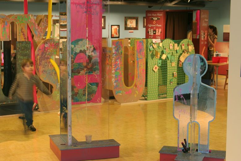 The exhibit environment is intentionally left unfinished and changeable, so that visitors not only interact, but also create the space around them. Children engage in art-making using both traditional and innovative materials. At the letters, for example, children chalk on the “u”, tack sticky notes up on the “m”, and walk right through the “e” linen portal. Each letter provides either storage or creative surface on which artwork, messages, and more are applied. The museum letters become an ever-changing landscape. Nearby art-making stations include a clay bust interactive where children work side-by-side exploring their own likeness and a Plexiglas-interactive where visitors paint each other on full-size child-cutouts. Kaleidoscope for Kids is a tubular mini-environment lined with mirrors for the youngest of artists.