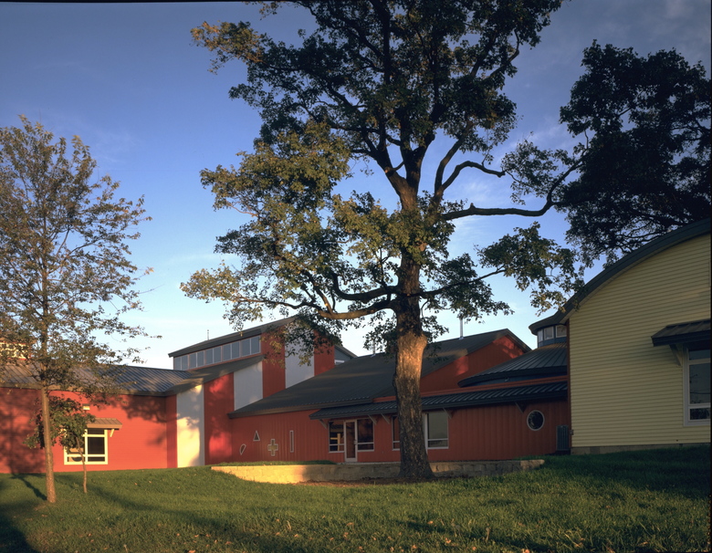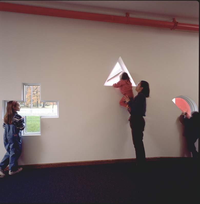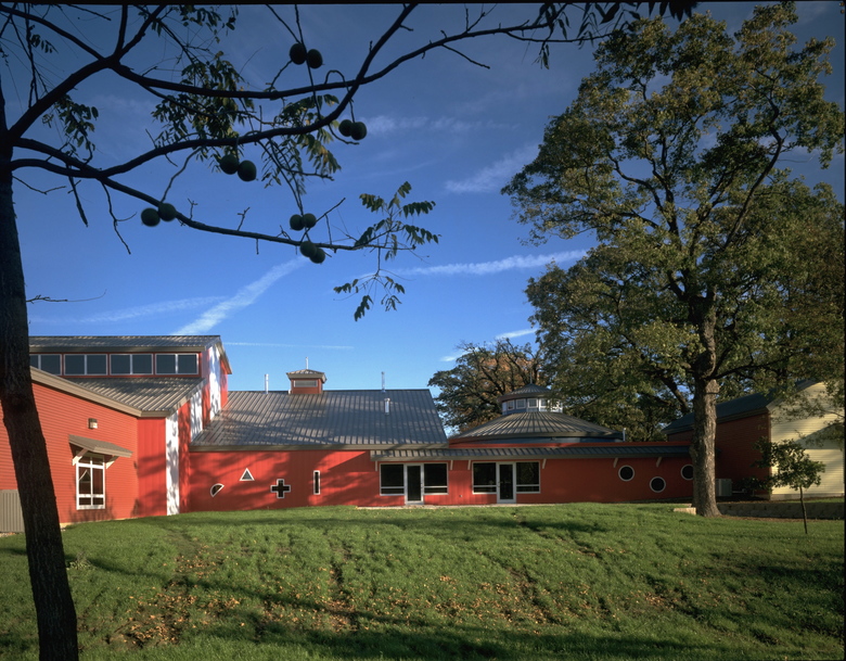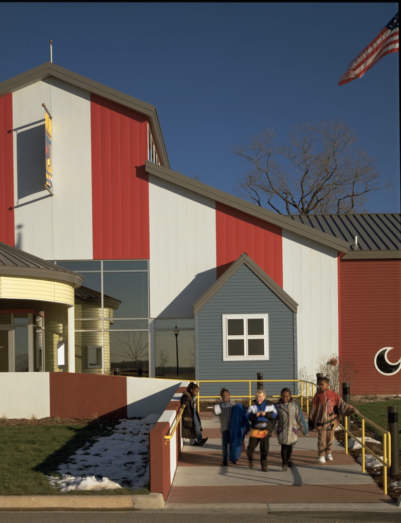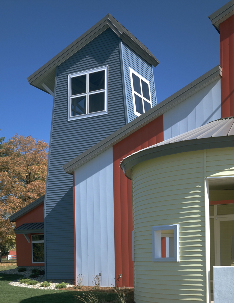 The ad-hoc collection of interconnected barn structures recalls the image of the Mid-Western farm but, through unexpected color combinations, whimsical windows, and a series of other details, it is clearly a container for play and learning. This impression is essential in order that the building be embraced by its community and identifiable to children.