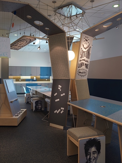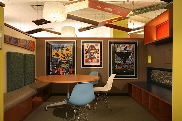 The Dragon Trees create vistas within the children's library, while taking advantage of the views out-of-doors. Color palettes are warm, charming, and sophisticated.
