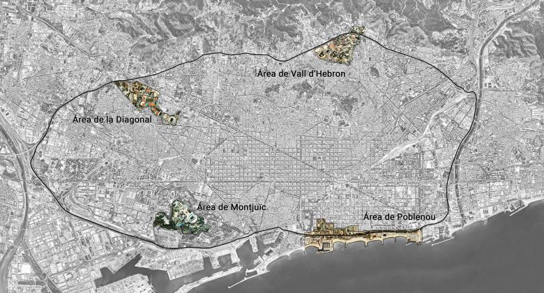 Es van triar quatre grans àrees olímpiques: Montjuïc, Diagonal, Vall d’Hebron i Poblenou que, situades en punts estratègics de la ciutat, formaven un quadrat unit per les noves rondes i redefinien el centre de la ciutat. Eren zones “perifèriques” de Barcelona que vivien una situació crítica de marginació, causada sobretot per problemes d'accessibilitat. La seva transformació va produir una regeneració de l'entorn per efecte d'osmosi, garantint una major continuïtat urbana amb les zones més consolidades de la ciutat.