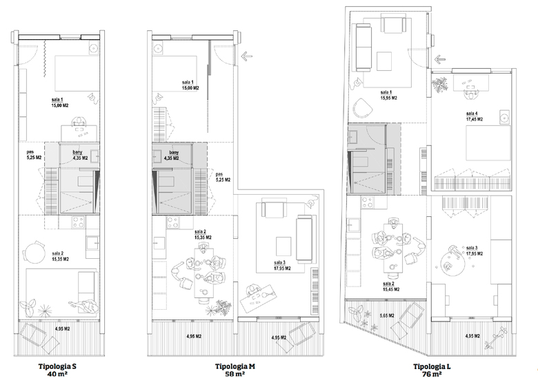 Els habitatges es constitueixen partint d'una tipologia basi de 40 m2, a la qual s'afegeix un o dos mòduls per formar habitatges més grans. D'aquesta manera, l'estructura resulta ser bastant flexible, permetent adaptar els habitatges a les necessitats futures dels usuaris. En total hi ha 50 habitants que conformen diferents unitats de convivència: persones soles, parelles amb o sense fills i adults que cohabiten.
