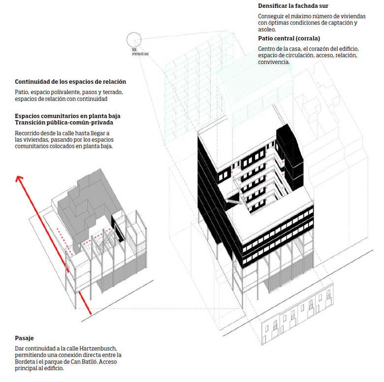 El programa de l'edifici preveu 28 habitatges de diferents tipologies i espais comuns, que s'articulen al voltant d'un pati central, que recorda les corralas, tipologia d'habitatge social i popular. Aquests espais estan en la planta baixa i són: una cuina-menjador, un espai de treball compartit, una bugaderia, una sala polivalent, un espai per convidats, una sala de salut i cures i un aparcament per a bicicletes. A més es troben espais exteriors i semi-exteriors com el pati, el terrat amb coberta verda, una terrassa amb horts urbans, i trasters col·lectius que es distribueixen en cada planta. Per crear aquests espais col·lectius cada usuari ha cedit uns 10 m2 de la superfície dels seus habitatges; fet que marca una vegada més la implicació de la comunitat d'habitants, on cadascun participa pel ben comú.