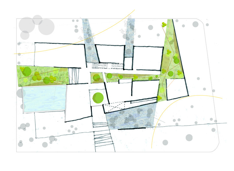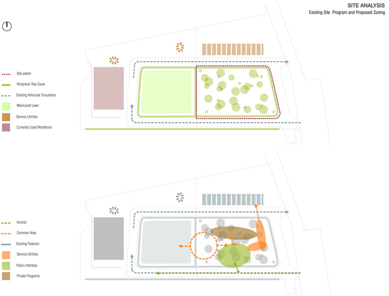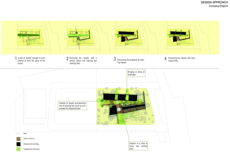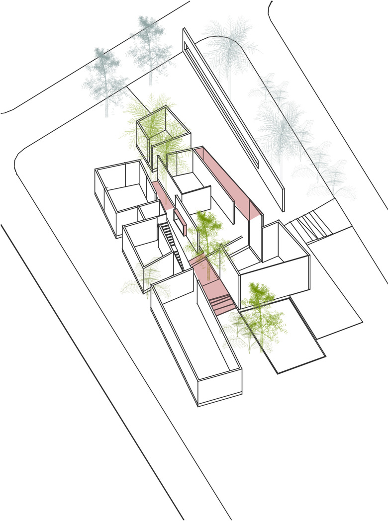 The proposed residence is part of the development of 8 acres of land privately owned by a family in Kotturpuram, in the heart of Chennai. The heavily wooded site on the banks of the Adyar River, also abutted by private paddy fields, offers a rare opportunity to live amidst nature within the hustle of the city. The existing architectural components of the site are the current residence of the family, a number of automobile stalls and servants’ quarters.