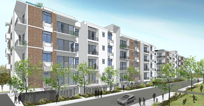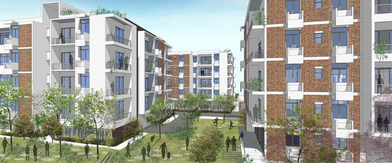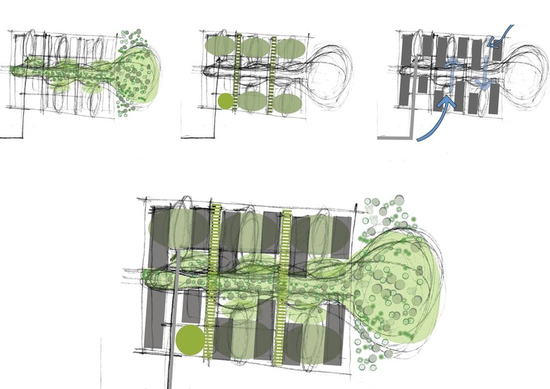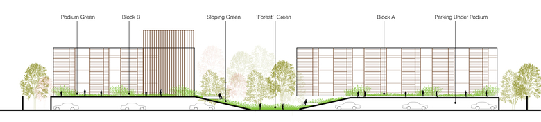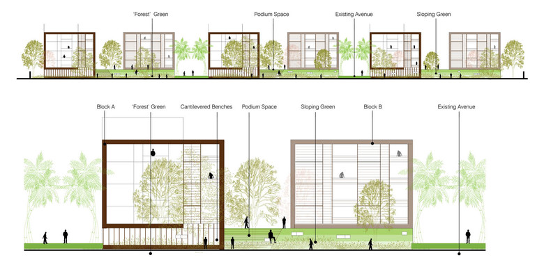 The buildings are seen as a series of modular blocks which are lined up on either side of the ‘forest’ and are staggered to create an interesting architectural intervention, extending and retreating in turn. The emphasis is again, on creating a rich pedestrian experience for the community, by retaining the organic character of the forest green and contrasting it with the simple and functional architecture of the buildings straddling it.