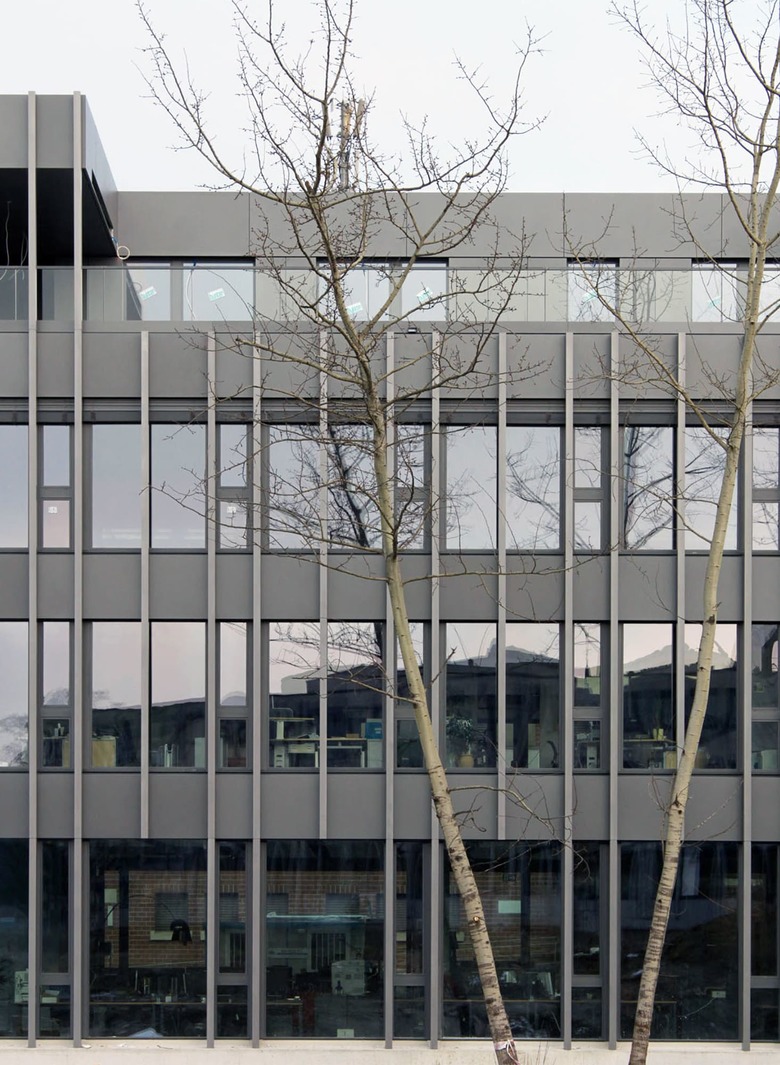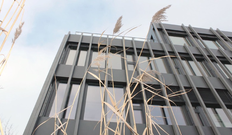 der baukörper fügt sich auf einer restfläche in die struktur der bestehenden gewerbegebäude ein. das kompakte volumen ruht auf einem sockel, welcher die einstellhalle beherbergt, und wird durch rücksprünge im erdgeschoss für den eingangsbereich bei den terrassen in den oberen geschossen gebrochen. das gebäude ist konsequent auf einem raster aufgebaut, welcher sich in der von der fassade losgelösten stützenordnung und in der gliederung der vorgehängten fassade zeigt. die vertikalen stehlen der fassade stehen symbolisch für das einst prägende schilf des ehemaligen riedgebietes und hüllen das gebäude in ein fragiles kleid, welches je nach blickwinkel das innere offenbart oder nur erahnen lässt.