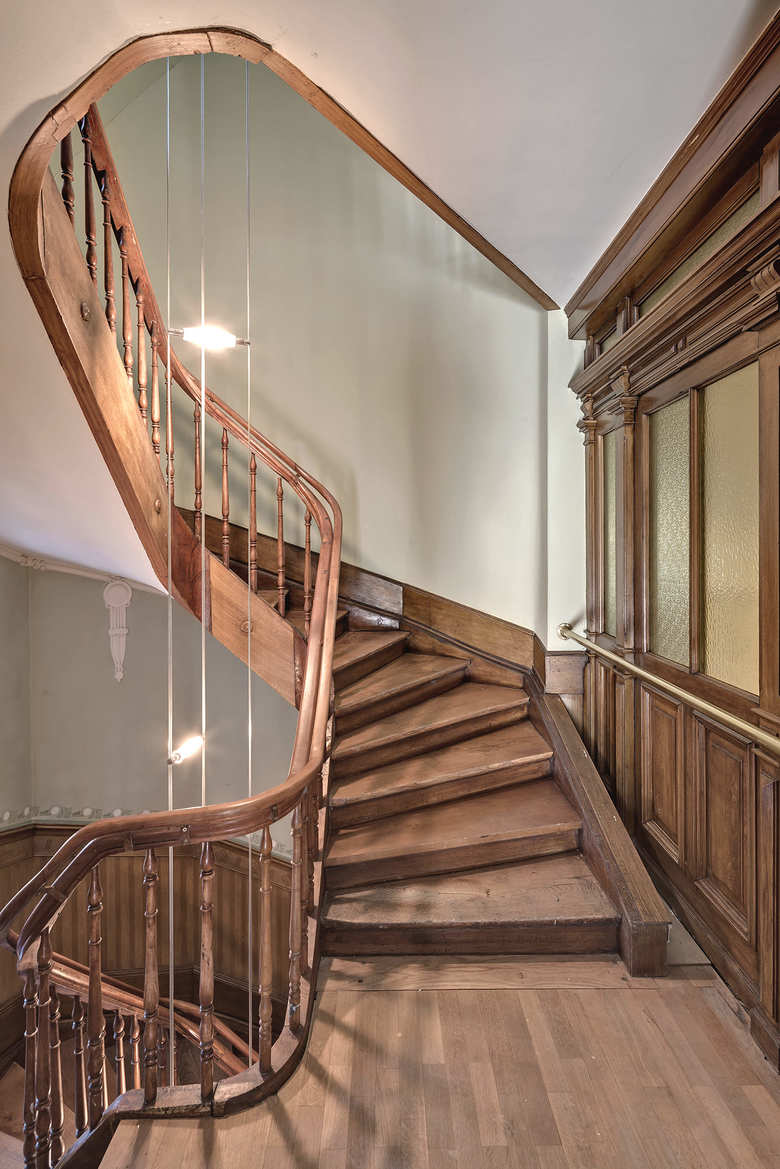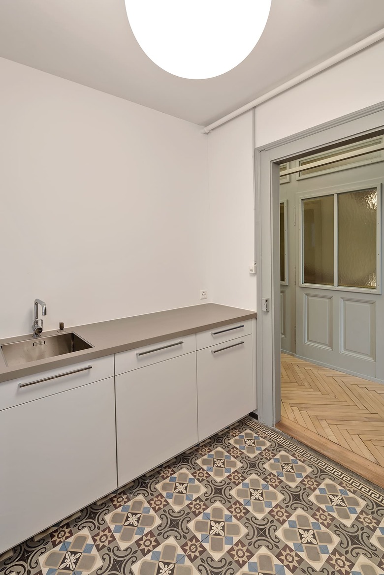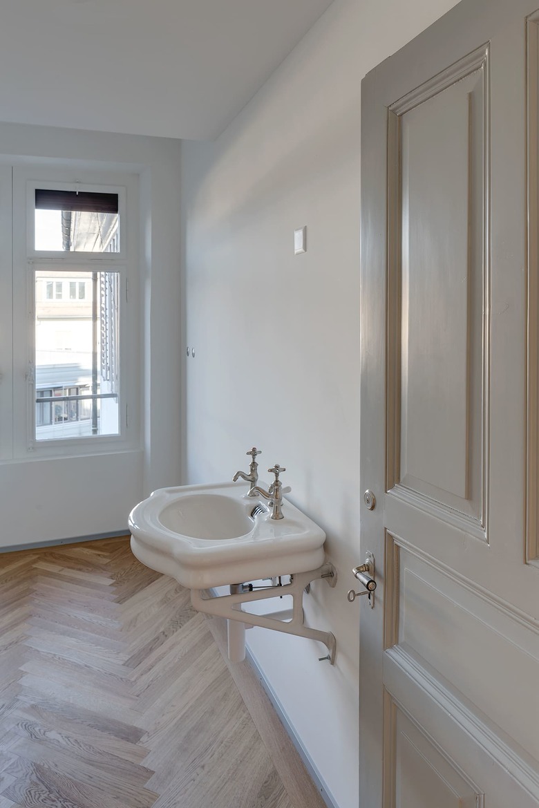 um eine wohnnutzung zu ermöglichen wurden die fenster für einen ausreichenden lärmschutz ersetzt und die geschossdecken der wohnungen für einen guten schallschutz umgebaut. hierfür wurden die historischen massivholzböden aus- und anschliessend mit neuem trittschallaufbau wieder eingebaut. die haustechnik wurde komplett entwirrt und neu pro geschoss und gebäude autonom aber flexibel verbindbar neu aufgebaut.