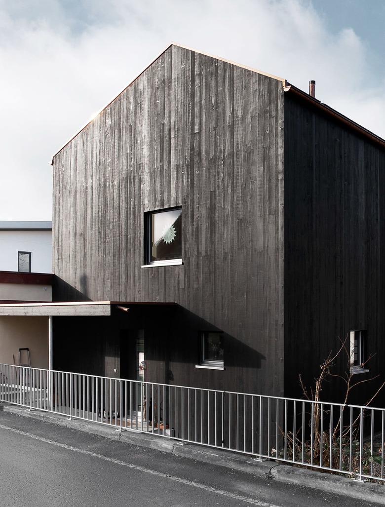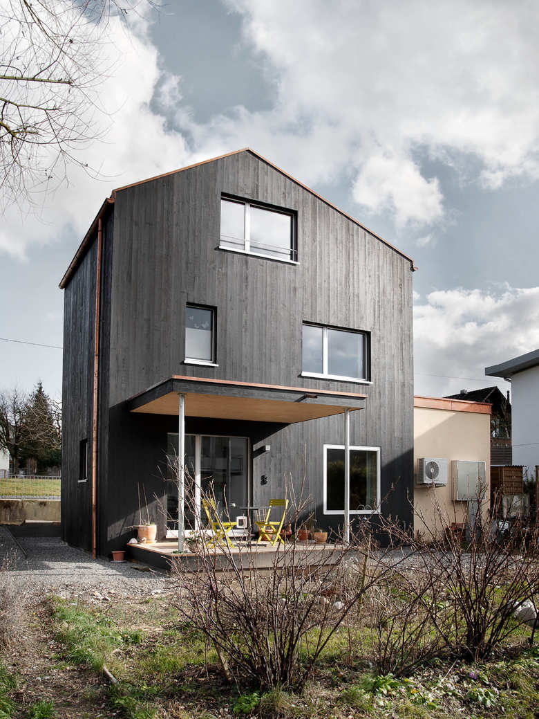 beim umgang mit der landfläche und bei der wahl der materialien hat stets ein möglichst schonender umgang mit der umwelt und den zur verfügung stehenden ressourcen im vordergrund gestanden. so beansprucht das kleine haus mit eigener materialisierung und formensprache keine parzelle für sich, sondern steht als „stöckli“ angebaut an eine alte garage im garten eines bestehenden wohnhauses. das einfache, klare volumen wird nach oben durch ein flaches, asymmetrisches satteldach abgeschlossen.