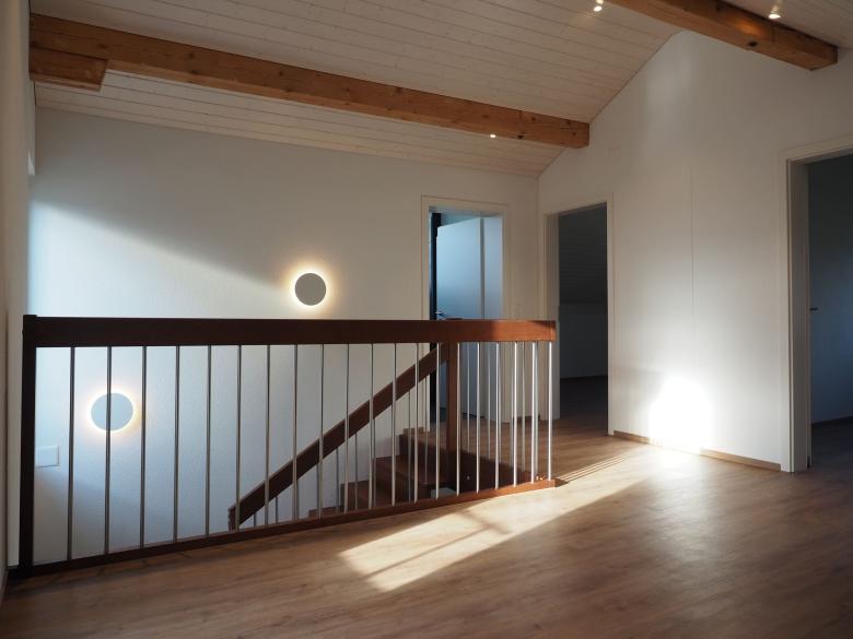 innenräumlich wird das haus mit dem umbau komplettsaniert und allgmein grosszügiger und offener gestaltet. die moderne treppe ermöglicht erstmals die durchgehende verbindung über alle geschosse. tageslicht gelangt dabei vom obergeschoss in die unteren räumlichkeiten.