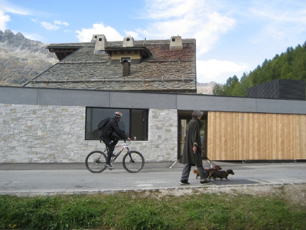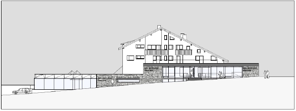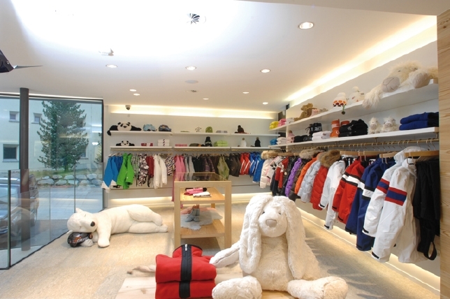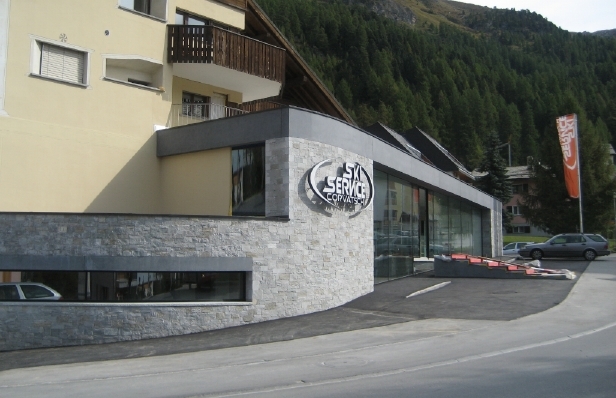 Mit einer Wand aus Luserner - Naturstein erweitert sich das bestehende Geschäftslokal zur Straße, deren Krümmung von der Wand aufgenommen wird. Diese Wand ist wie eine Spange, die den tiefer liegenden Eingang für den Skiverleih mit dem höher liegenden Eingang ins Sport- und Modegeschäft verbindet, um die Straßenecke knickt und bis zu Nebeneingang und Garagen führt.