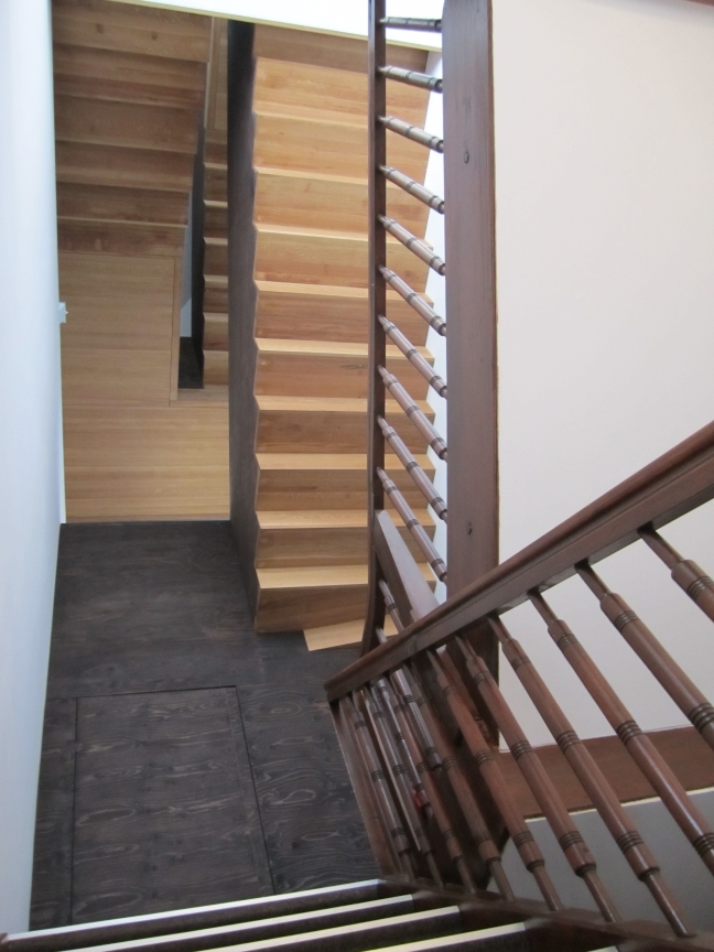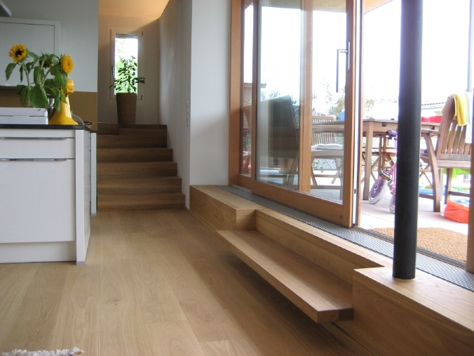 Das 1. Obergeschoß ist das Wohngeschoß der Familie, ein großzügiger offener Wohn-Essbereich mit direkt vorgelagerter, gedeckter Terrasse nach Süden ermöglicht ein offenes Wohnen von innen nach außen. Die vertikale Erschließung wurde ab dem ersten Zwischenpodest neu konzipiert und die neue Stiege wurde wie eine Skulptur dem Haus eingefügt.