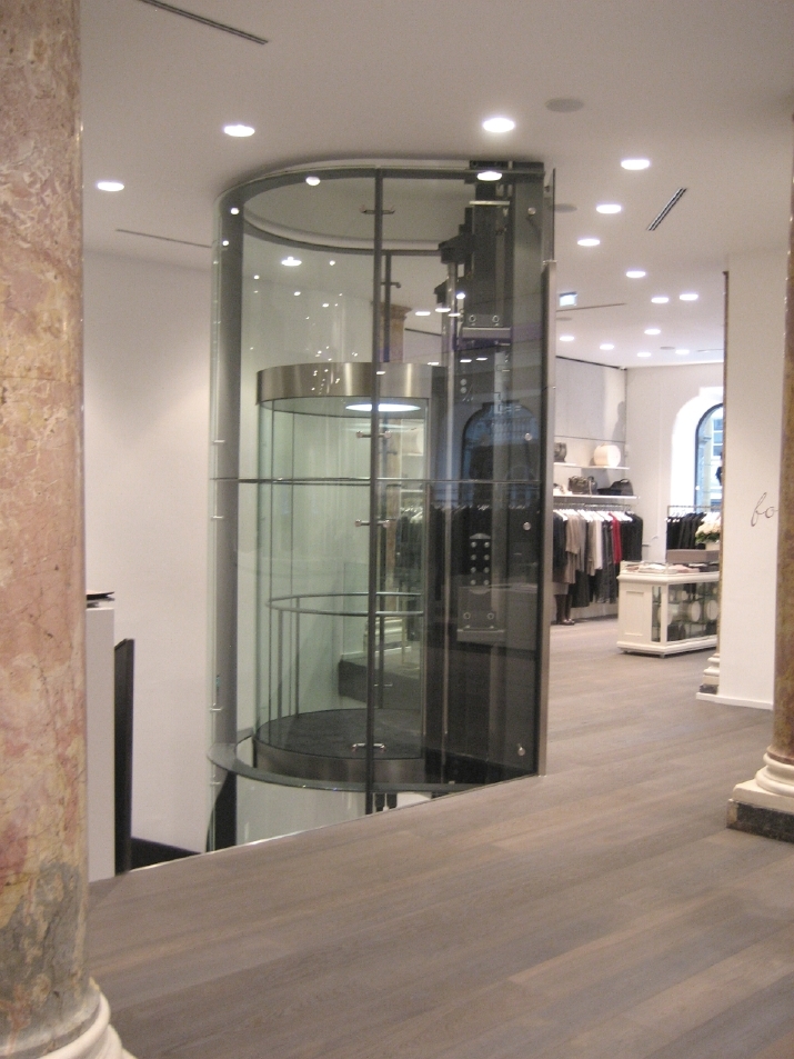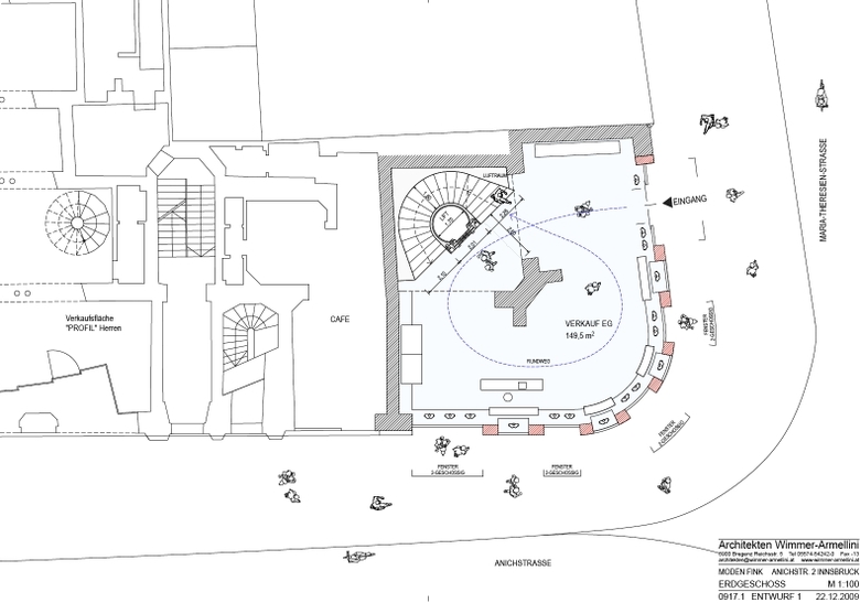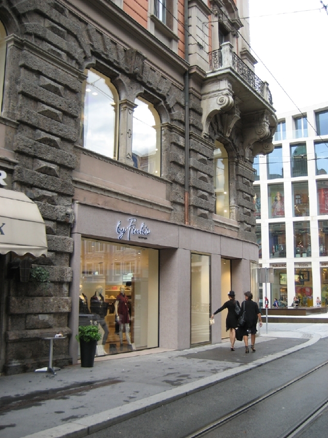 Durch ein neues Fassadenkonzept wird dem historischen Bauwerk aus dem 19. Jahrhundert die fehlende Basis durch die Umbaumaßnahmen in den 1970er Jahren an dieser städtebaulich wichtigen Stelle in der Stadt wieder zurück gegeben. Mit aktueller Material- und Formensprache wird auf die Bedürfnisse von Transparenz in der Geschäftsfassade reagiert. Blickbeziehungen von und zur Fußgängerzone Maria-Theresinestraße in die Verkaufsflächen im Obergeschoß werden nun möglich. Historische Wandpfeiler und Natursteinsäulen sind in das Geschäftskonzept integriert werden. Durch den Einbau eines verglasten Liftes über 3 Geschoße wurden alle Ebenen barrierefrei miteinander verbunden.