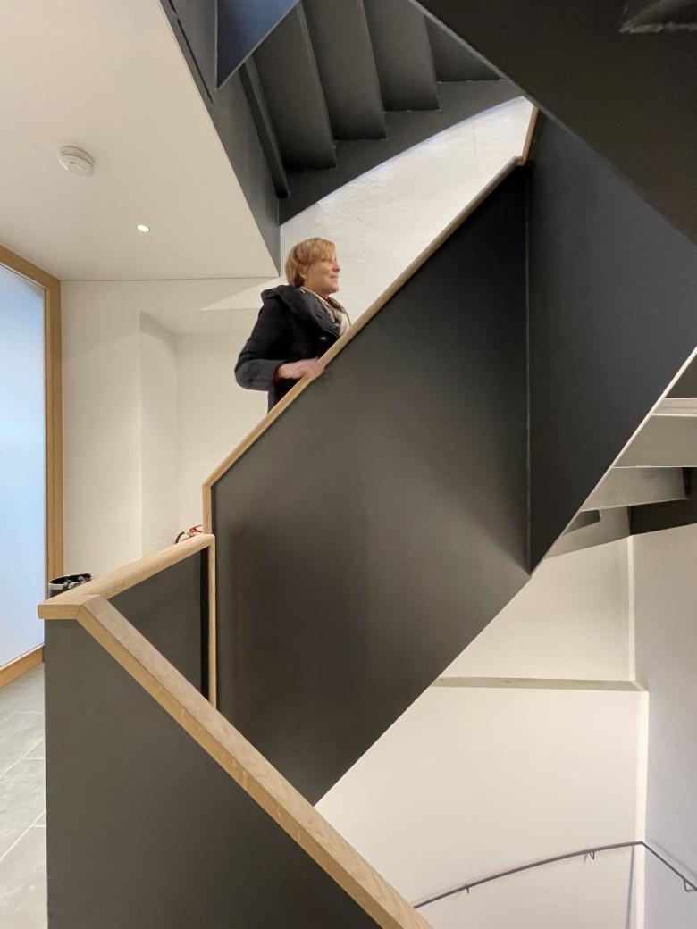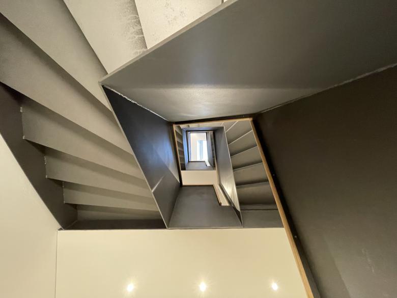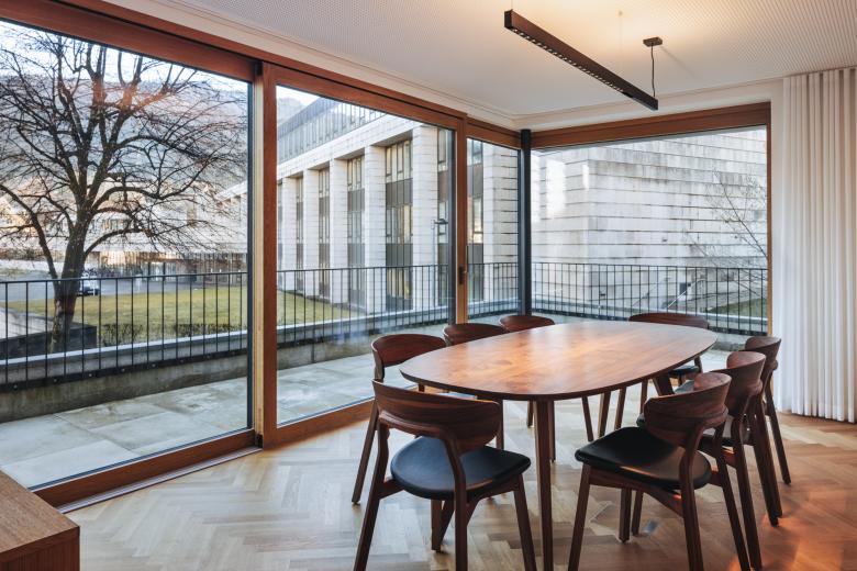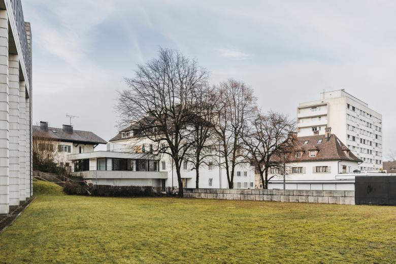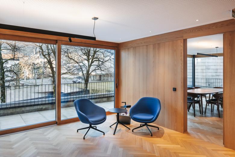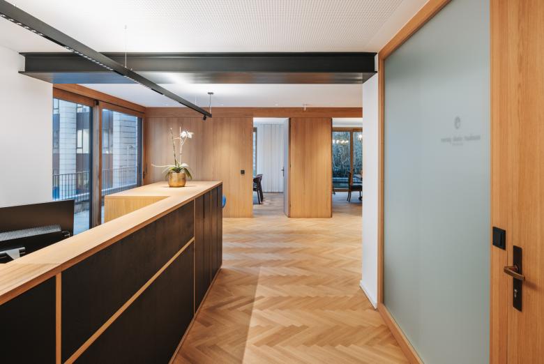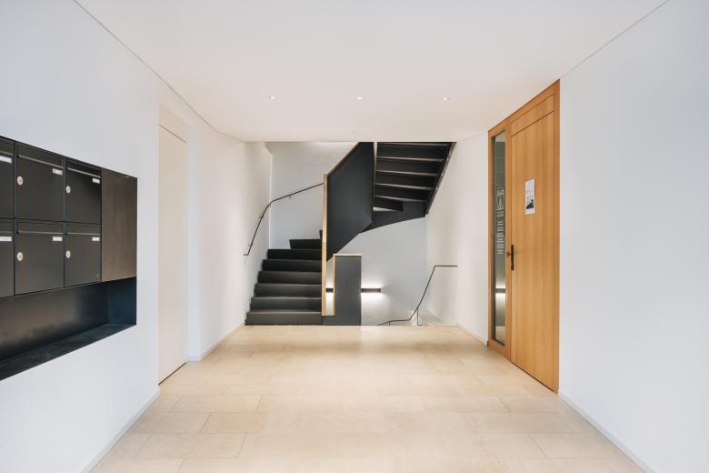 Die Eingangssituation wurde zur besseren Orientierung umgestaltet, um ein Portal ergänzt und ein neues Stiegenhaus als eigener Brandabschnitt durch das ganze Haus gezogen, die Möglichkeit eines späteren Lifteinbaus wurde vorgesehen und eingeplant. Das EG des Gebäudes wurde durch eine Rampe in der Eingangshalle barrierefrei gestaltet. Im EG befindet sich eine Physiotherapiepraxis, im 1.OG wurde die bestehende Kanzlei um großzügige neue Besprechungs- und Sozialräume erweitert. Im 2.OG wurde eine große Bestandswohnung in zwei Wohnungen geteilt und um neue, ruhige Terrassenflächen erweitert. Das 3.OG wurde nur im Bereich des neuen Stiegenhauses umgebaut, eine neue Stahltreppe erschließt alle Geschosse.