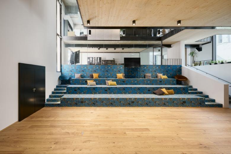 Die Nutzung des bestehenden Foyers wurde zu einem Begegnungs- und Pausenraum für den gesamten Gebäudekomplex ausgebaut. Die formale Verbindung zwischen Saal und Foyer ist fließend. Die bestehenden Terrazofelder sind mit Holzdielen eingefasst. Dieser Bodenbelag geht in den Holzboden der Halle über und schafft so eine atmosphärische Verbindung zwischen den beiden Bereichen. Der Kupfertresen im Foyer schafft einen räumlichen Abschluss und ein verheißungsvolles Ziel für die Pause.