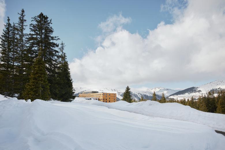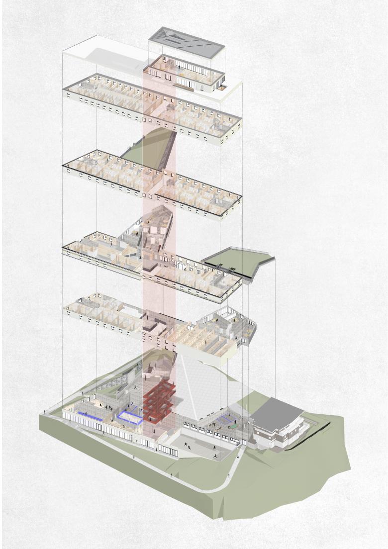 Der Zugang zum Hauptbaukörper erfolgt durch eine eingeschossige, über die gesamte Breite verglaste, Fläche vom Dorfplatz aus. Diese Fläche entspricht in ihrer Höhe den eingeschütteten Gebäudeflügeln die den Dorfplatz flankieren und lässt den Hauptbaukörper wie eine Brücke über den Dorfplatz schweben. Räumliche Komplexität entsteht bei der Annäherung an den Baukörper. Während man im Verlauf des Dorfplatzes tief in die Landschaft eindringt, ergeben sich immer mehr Blickbeziehungen durch den Hauptbaukörper hindurch in die vom Niveau niedrigere Landschaft auf der anderen Seite. Dies geschieht durch zahlreiche Lufträume zwischen den Geschossen die dem schlichten Baukörper bei räumlich näherer Betrachtung eine visuelle Durchlässigkeit verleihen. Das Erdgeschoß auf der Ebene des Dorfplatzes beinhaltet das Foyer, von dem aus die Geschoße mit Rampen erschlossen sind. Diese Erschließung ist mittig über die gesamte Breite des Längsbaukörpers positioniert und streckt den Raum des Foyers durch das Luftloch in der Mitte der Rampen in die Vertikale. Die Vertikale der Rampenerschließung und die zahlreichen Lufträume zwischen den Geschossen entwickeln eine räumliche Symbiose und ermöglichen reichhaltige Querblicke zu einer dreigeschossigen Kletterwand, die im UG 2 beginnt und bis ins 1.OG reicht, zu einer Sporthalle im zweiten UG, sowie zu zahlreichen weiteren Freizeitaktivitäten, wie Trampoline und Schnitzelgruben. Durch die zentrale Positionierung der Haupterschließung definiert diese die innere Typologie des Baukörpers in einen West und Ost Trakt, in denen jeweils eine eigene Fluchttreppe am Gebäudeende situiert ist. Am oberen und unteren Ende wechselt die Erschließung von Rampen auf Treppen, um die vertikale Erschließung weiter auszudifferenzieren. Beide Gebäudetrakte sind halbgeschossig zueinander versetzt und nehmen so die Topografie der Landschaft auf. Ein Personenlift verbindet alle Geschoße .