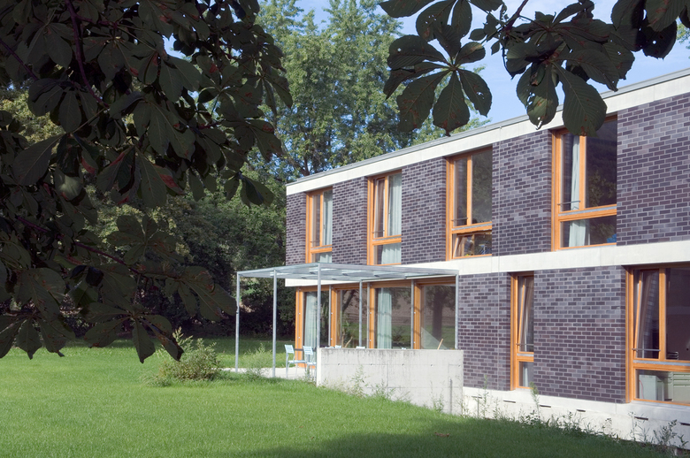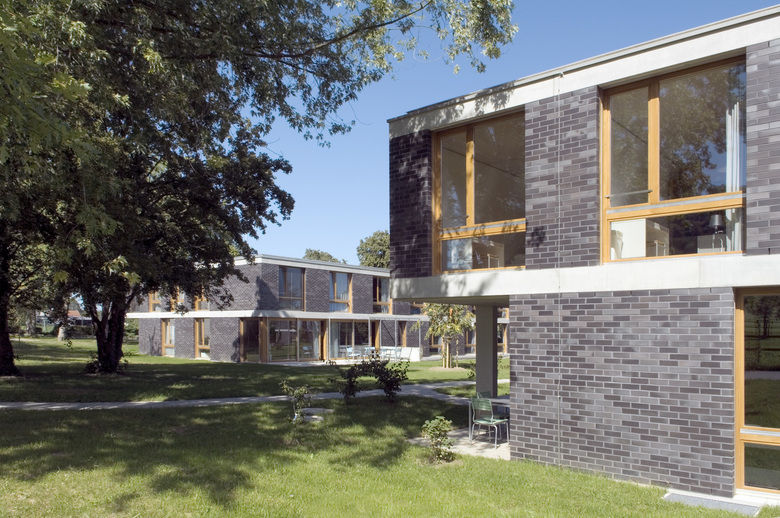 Die alten Gruppenhäuser erfüllten die Anforderungen nicht mehr und mussten abgebrochen werden. Auf die bestehenden Kellergeschosse wurden 2-geschossige Neubauten für jeweils zehn Jugendliche aufgebaut. Die Eichenfenster und die mit Betonelementen gegliederte Klinkerfassade stellen den Bezug zur Parkanlage her.