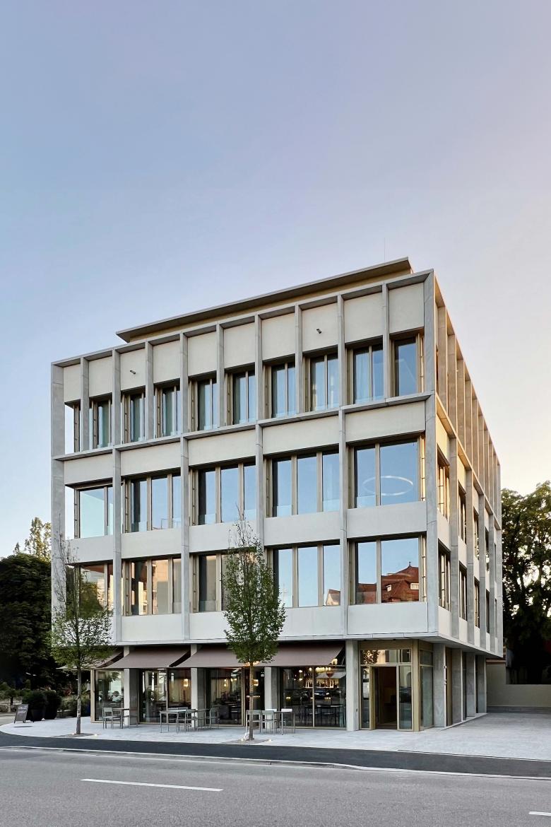 Auf den zwei in Massivbau erstellten Untergeschossen bildet der Kern, die Flachdecken mit den Skelettstützten und dem leicht konstruierten Attikageschoss die Grundlage für die vorgesetzte und schmuckhafte Fassade in Naturstein und vorfabrizierten Betonelementen. Die Historie wird durch den lokal abgebauten und in der Stadt als Baumaterial heimischen Muschelkalk in der Fassade aufgenommen und wiedergegeben. Textile, halbtransparente Sonnenschutzmarkisen und der grosse Glasanteil lassen das Haus allzeit in Interaktion mit der Stadt treten. Zur Ermöglichung dieses Austauschs funktioniert das Haus mit Bauteilkühlung, gespiesen durch die optimalen Grundwasserbedingungen des Ortes. Das Erdgeschoss ist Teil des urbanen Stadtraumes. Mit Stadtbäumen und der Pflästerung aus Gneis entlang der Bahnhofstrasse, wie auch dem sekundär orientierten Vorgarten, werden der Öffentlichkeit Raum und Möglichkeiten angeboten wie auch den Ansprüchen des Stadtgrüns Rechnung getragen.