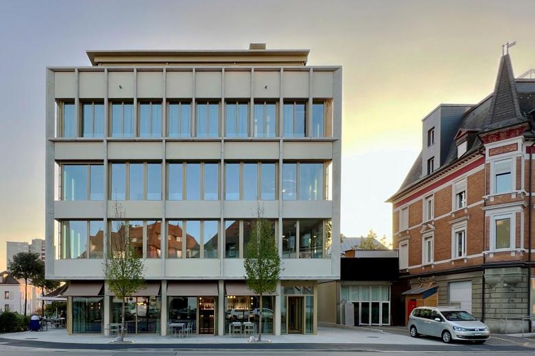 In Koexistenz mit der historisch gewachsenen Stadt soll durch den Eingriff ein Gefühl für die architektonische Kontinuität geschaffen werden. Ein Entwurf, der emotionale Resonanz erwirkt, in Bezug zu seiner Umgebung steht und Relevanz für unsere heutige Lebens- und Arbeitsweise hat. So orientiert sich der Baukörper an bestehenden Massstäben und vorhanden Proportionen und gibt diese in einer Neuinterpretation und einer modernen Struktur und Strenge wieder. Der Ort erfährt eine Transformation von der ehemals privaten Villa Lüthy zum öffentlichen Geschäftshaus, welches den Bezug zur Stadt sucht. Der aus dem Quadrat entwickelte Grundriss mit der umlaufenden, an allen Fassaden identischen Struktur und dem von der Skelettstatik umschlossenen Erschliessungskern, bildet die Grundlage und die Flexibilität für heutige wie auch zukünftige Nutzungen und Ausbauten.