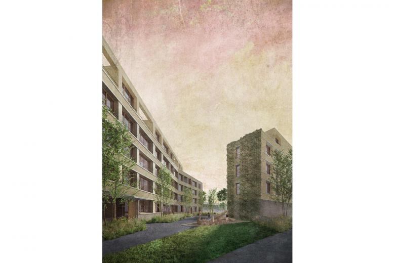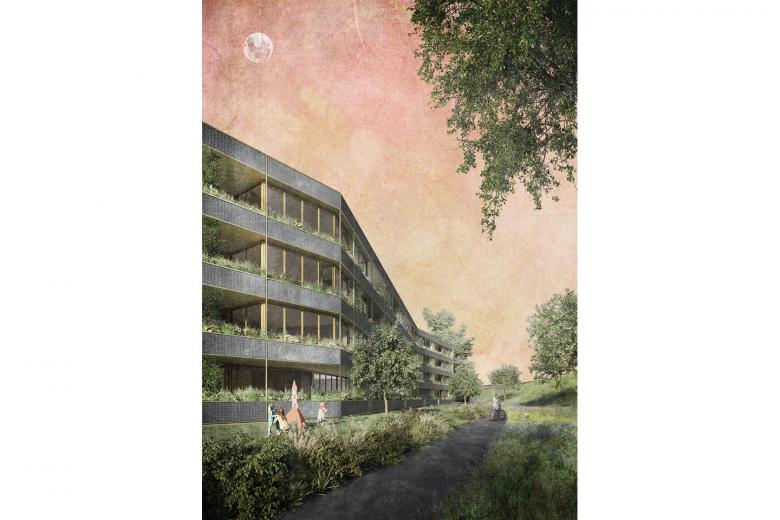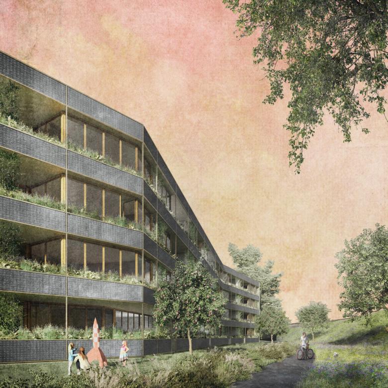 Zwei unterschiedliche Gebäude sind durch Modellieren und Ausschneiden aus einer Grossform heraus entstanden. Die Grundfläche wird durch eine zusammenhängende Grünfläche zusammengefasst. Eine Hartfläche als Grossform abgebildet, umklammert die beiden Gebäude und bindet diese zusammen. Der Belag führt bei den gemeinschaftlichen Erdgeschossnutzungen wie Gemeinschaftsraum und möglicher Kindertagesstätte bis an die Fassade. Im Bereich der Wohnungen bleibt der Belag abgelöst und unterstreicht so die private Wohnnutzung.