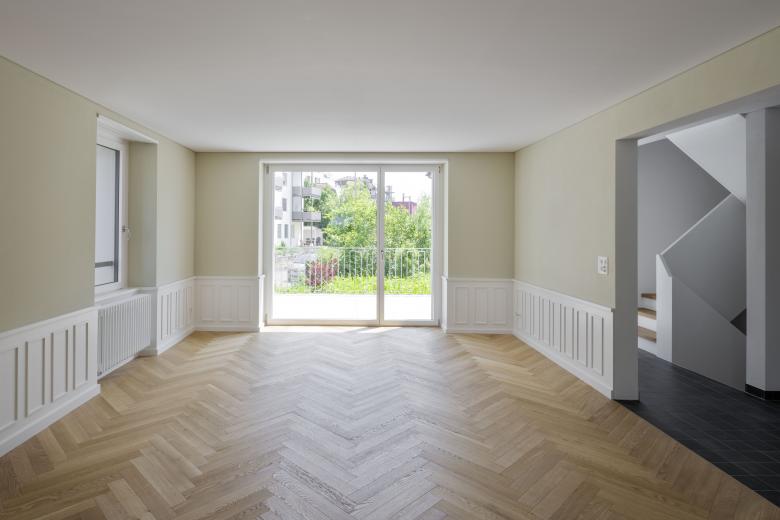 Die grösste Anpassung im Innenraum erfolgte bei der Eingangssituation. Diese führte früher von der Stapferstrasse durch den Garten hindurch und man gelangte durch eine kleine aussenliegende Treppe direkt in das innenliegende Treppenhaus. Eine Garderobe, oder der Platz dafür, war nicht vorhanden. Mit dem Erstellen des Carports, von der Seidenstrasse her erschlossen, bot sich die Gelegenheit, auch die Eingangssituation zu verbessern. Neu erfolgt der Zugang von der Westseite her. Über die neue Garderobe erreicht man das neu organisierte Wohngeschoss. Die Trennwand zwischen Essen und Wohnen wurde entfernt sowie das Fenster zum Garten hin vergrössert und bis zum Boden verlängert. Das neu erstellte Brüstungstäfer, die farbliche Absetzung der Wände und der hochwertige Fischgrat-Eichenparkett werten das Wohn- und Esszimmer zusätzlich auf. Die Grundrissdisposition im Obergeschoss wurde unverändert übernommen. Im Dachgeschoss wurden die Balken sichtbar belassen und gereinigt. Das nun voll ausgebaute Dachgeschoss mit zwei Lukarnen bietet Platz für ein grosszügiges Zimmer sowie ein neu erstelltes Badezimmer. Das vorhandene Hochparterre des Wohnhauses bot die Möglichkeit, ein zusätzliches hochwertiges Zimmer mit ausreichend natürlicher Belichtung im Untergeschoss zu erstellen.