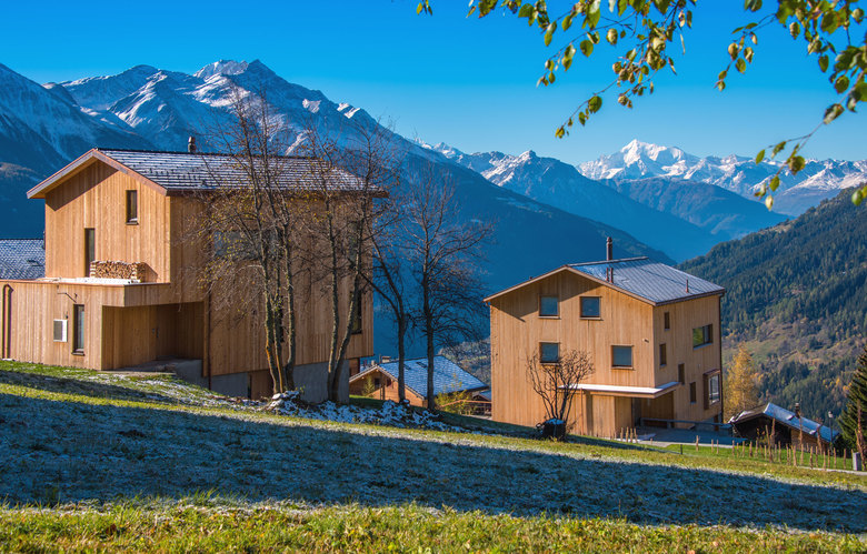 Die beiden Häuser liegen prominent auf einer Sonnenterasse über dem Walliser Rhonetal auf 1550 m ü. M. Die zwei Neubauten sind etwas oberhalb des historischen Dorfes angesiedelt und nur über einen Fussweg erschlossen. Beide Holzhäuser sind auf einem Steinsockel abgestellt. Die örtliche Bautypologie gab die Ausformulierung der beiden Häuser vor. Auch in den Innenräumen dominieren die Materialien Holz und Stein. Durch die grosszügigen Fenster sind die Räume lichtdurchflutet und bieten den Bewohnern eine wunderschöne Aussicht in die Berglandschaft.