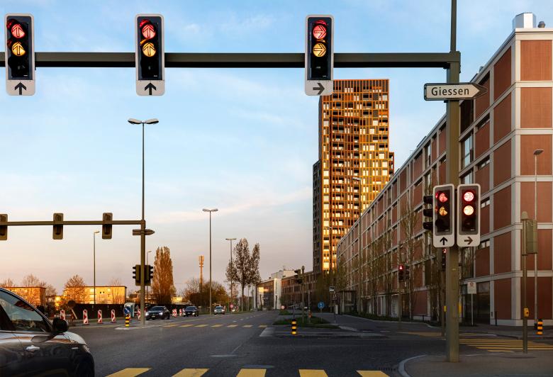 Das Hochhaus markiert die Schnittstelle zwischen dem suburbanen Gewerbe- und Industriebereich und dem gewachsenen, kleinkörnigen Kern der historischen Gemeindestruktur Dübendorfs.