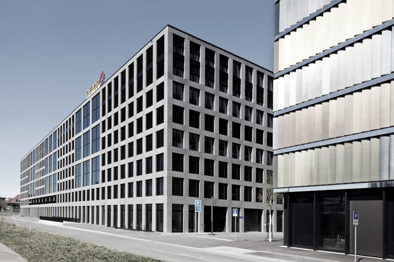 Der Städtebauliche Entwurf wurde hauptsächlich vom vorliegenden Bebauungsplan geprägt. Die Gebäudehöhe, die volumetrischen Masse sowie die festgelegten Gestaltungsgrundsätze mit der zu realisierbaren baulichen Dichte, basieren auf den Gegebenheiten des Entwicklungsplans Wankdorf City. Mit der sowohl strengen als auch verspielten Fassade wird das urbane Potential voll ausgeschöpft. Diese klare aber verspielte Gliederung gibt dem Baublock ein städtisches Gesicht und verleiht dem Volumen eine klare Adresse. Das Gebäude hat 7 Vollgeschosse ist 131 m lang, 40 m breit und 29 m hoch.