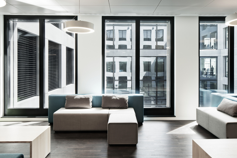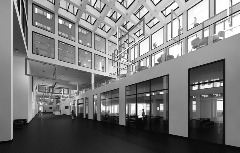 Die äussere Grosszügigkeit des Baukörpers findet auch im Innern seine Fortsetzung. Die wird in der grosszügig überragten Eingangspartie und der markanten, inneren Horizontalverteilung spürbar.