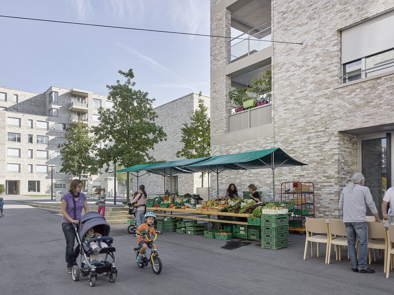 In der Erdgeschosszone der Siedlung sind verschiedene Dienstleistungen - Kindergarten, Kindergarten, Bäckerei, Reformhaus, Friseur und mehr - untergebracht.