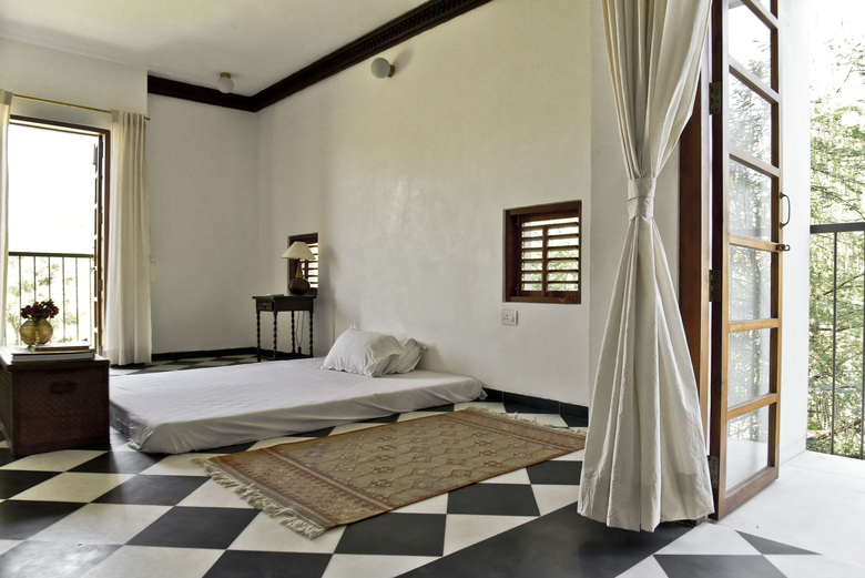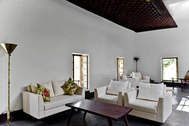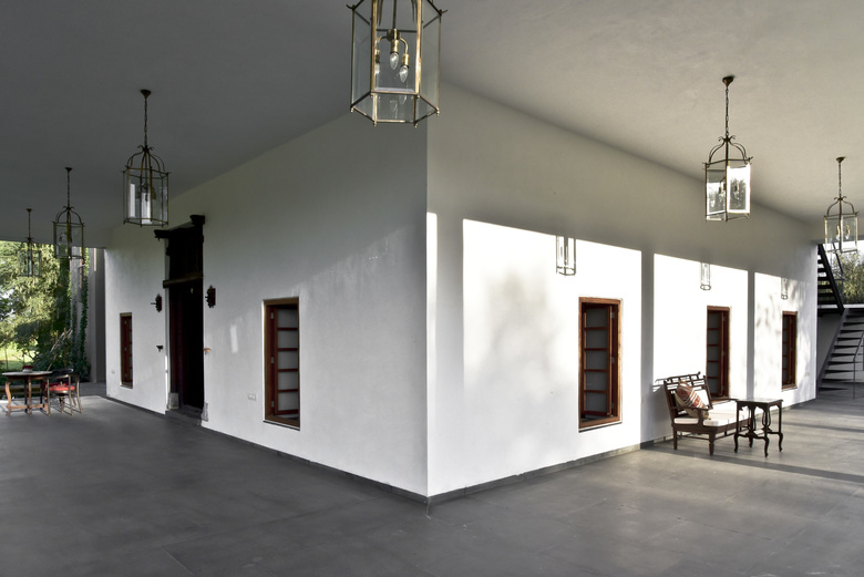 The house in the landscape was recreated from the pieces of a 300 year old haveli. In this structure we merge new and old systems of assembly, combining 18 inch brick walls in concrete frame with gutai lime plaster and restored tel paani finished teakwood elements. The basic form follows the original courtyard layout, flanked by bedroom, kitchen and mezzanine, while the wrapping terrace and sunken entry extend into the spaces outside, to transform the original row house layout into a part of the landscape.