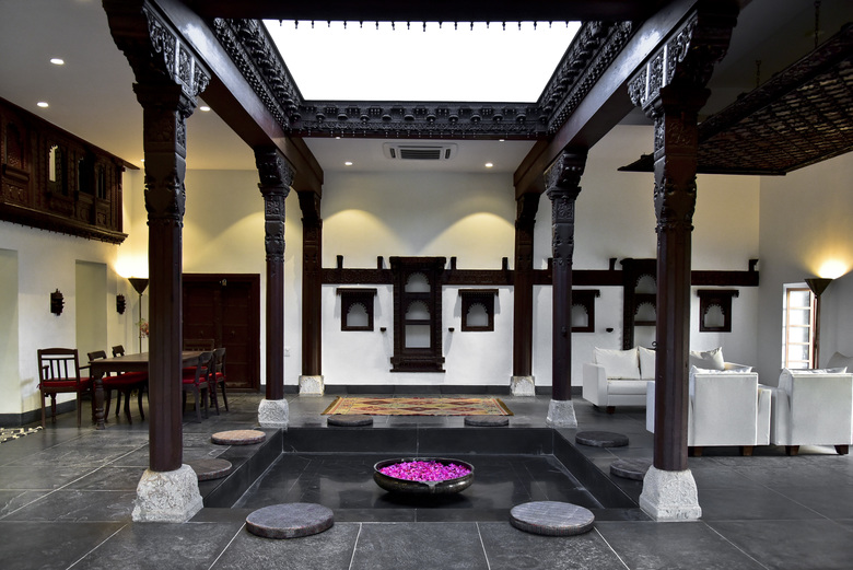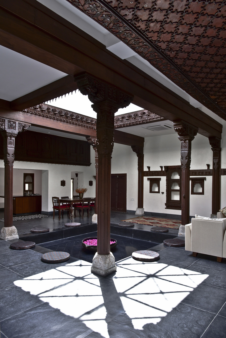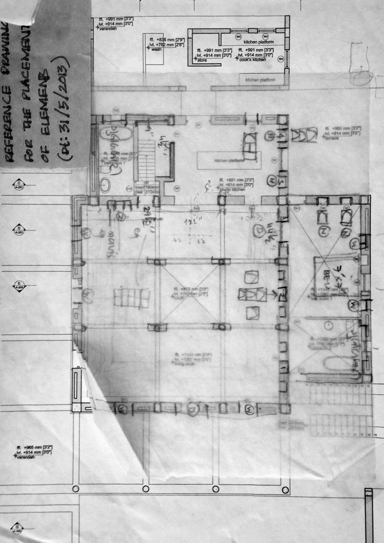 The process began with a video, taken by an owner ready to demolish a termite damaged but beautiful row house in northern Gujarat. Normally when this type of house is destroyed its parts of value are sold to various antique dealers. Instead, our client acquired the entire house, packed up all its parts, and stored them on his property near Ahmedabad. We began the conceptual design process with the video and a short list of elements with their basic dimensions. Only after agreeing on the direction of the design did we take one day (because we couldn’t risk the damage or theft associated with leaving elements out all night) to unpack as much as we could and measure critical dimensions. Already there we found many pieces not present in the list, and barely covered in the imagery. From those basic measurements we drew up the elements and developed the design. The first time we could completely open the elements and start to puzzle them out came after the columns, roof and plinth were finished. It was then that we began the conversations with our carpenters about what, where and how, given the basic framework of the courtyard we had seen and planned. As elements were unearthed, projected locations shifted to accommodate new pieces, or to hold related parts. We gradually moved away from drawings, making more decisions on site, because the argument couldn’t be divorced from the place and the artisan’s perspective.