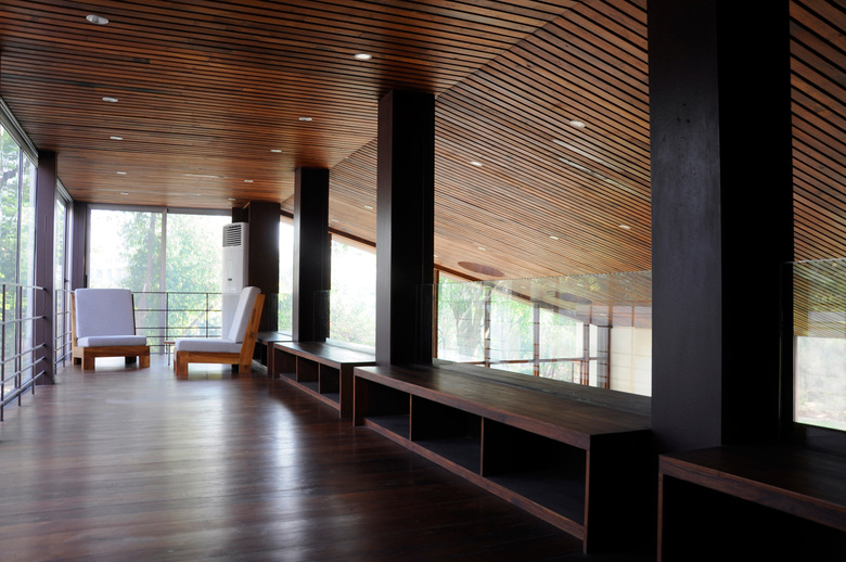 The composite structure uses steel to create the frame of the lounge and merges it with the concrete and brick of the service area by embedding the members in walls while allowing the steel to emerge when the space opens into the water and trees.