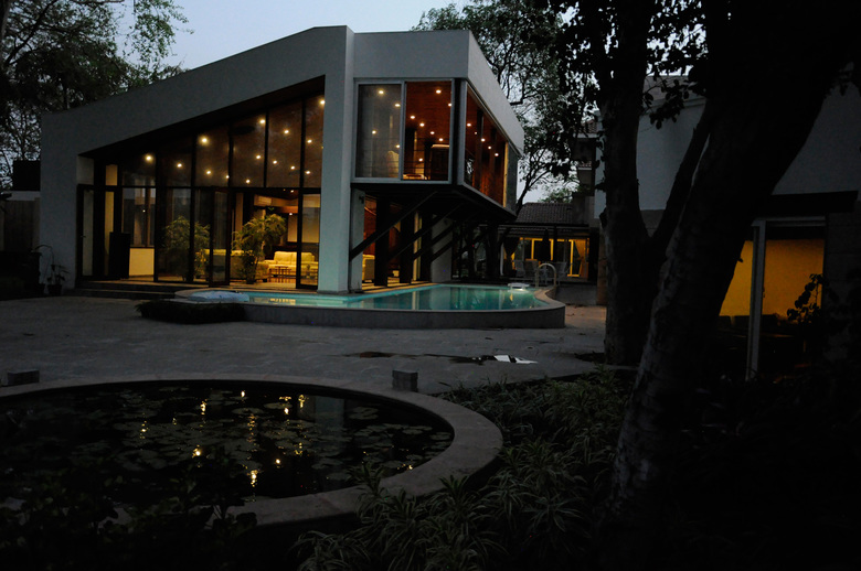 This structure adds a new lounge and service area to a residential campus by transforming the space behind the existing house into an active street that engages both old and new structures, formed by a series of waterbodies that move along a glass facade and end in a bridge that lightly connects existing to new.