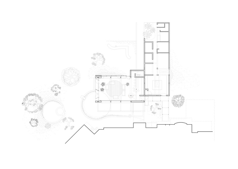 Placed in an already densely grown grove, the new lounge sits as a pavilion among trees. The lifted plane of the roof recreates the ground at the level of the leaves, and from it is suspended a balcony that overlooks the pool.