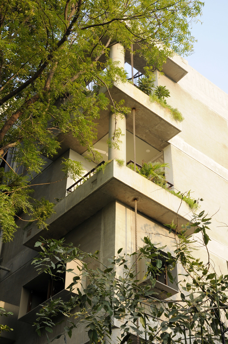 The house in the landscape was recreated from the pieces of a 300 year old haveli. In this structure we merge new and old systems of assembly, combining 18 inch brick walls in concrete frame with gutai lime plaster and restored tel paani finished teakwood elements. The basic form follows the original courtyard layout, flanked by bedroom, kitchen and mezzanine, while the wrapping terrace and sunken entry extend into the spaces outside, to transform the original row house layout into a part of the landscape.