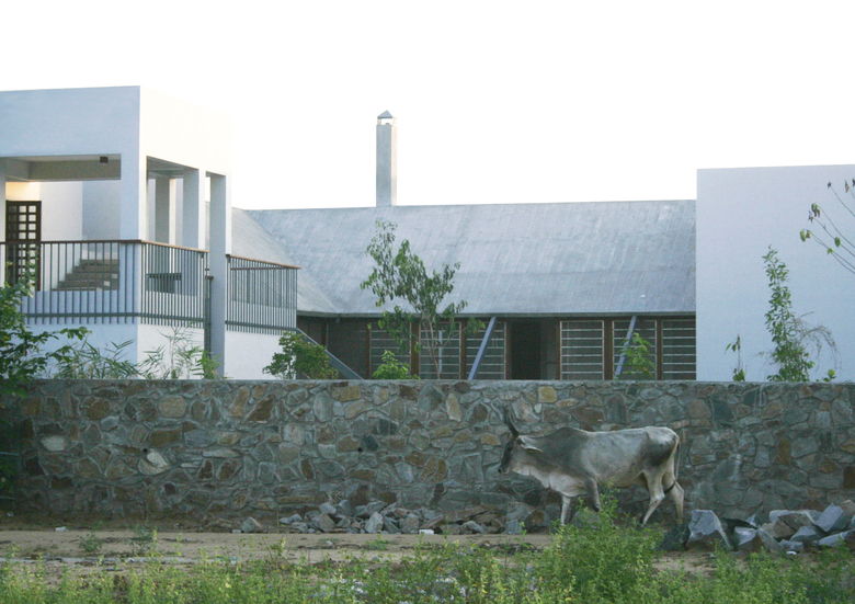 To support their condition of living between inside and out, the home consists of a group of shaded volumes clustered around an L-shaped verandah. Sheltered under the large roof, rooms are surrounded by open passages that draw wind through the house like a sieve. Thick brick walls temper the inside spaces against high diurnal temperature variation. The roof doubles as a summertime sleeping terrace, protected with high walls pocked by openings for targeted ventilation, and during monsoon it gathers rain for storage in a 40,000L underground water tank.