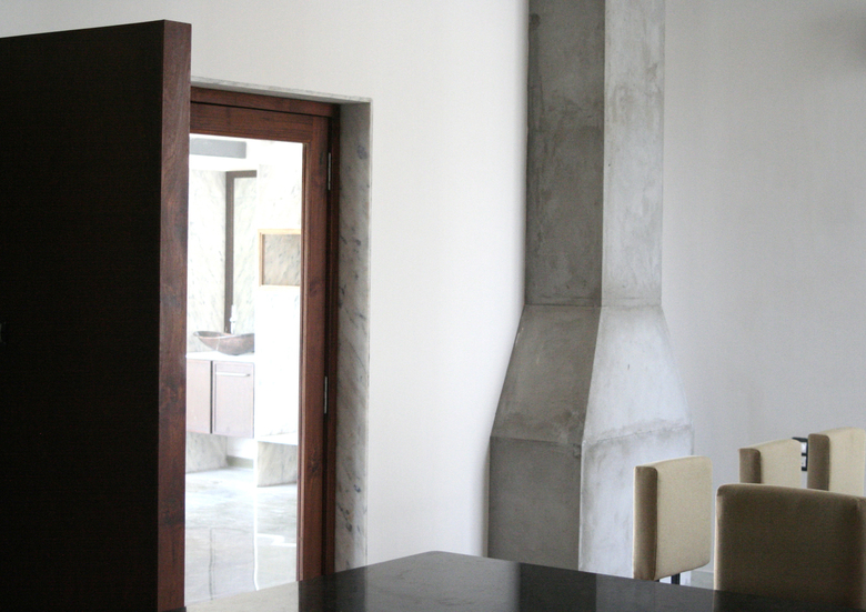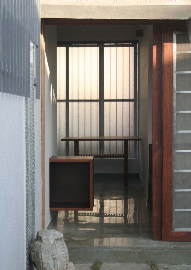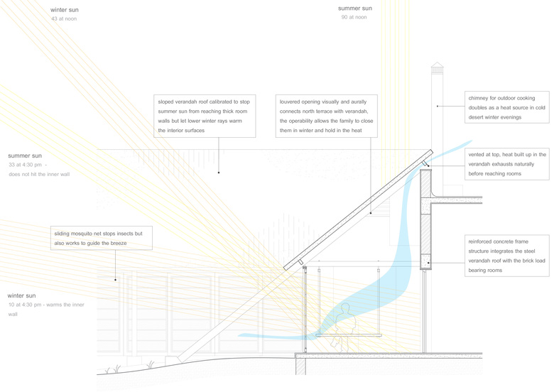 The verandah is the heart of the house. All rooms and all levels empty into it, and it mediates the experience between inside and out. Because much of the family activities occur in this intermediate space, what might have become a passage instead is a place. As a climate responsive element, it absorbs and exhausts the heat of the summer, welcomes warmth in winter, and encourages the movement of air in muggy monsoon. The high summer sun cannot reach direct room walls, and the sloping roof with ventilated openings at the top allows the hot air to rise and naturally exhaust, moving it faster because negative pressure behind the thrust of the wind moving up the verandah roof draws air out faster. In winter, these openings, which are fitted with operable louvers, can be closed to hold in the hot air. The fireplace in the verandah also adds to radiating heat in the space. In monsoon, and on summer evenings, gaps between the room clusters open to draw air through the space, cooling both the verandah and the outer surfaces of inside rooms.