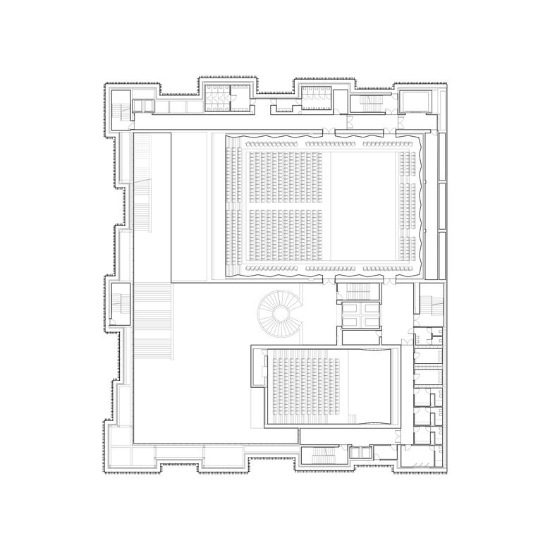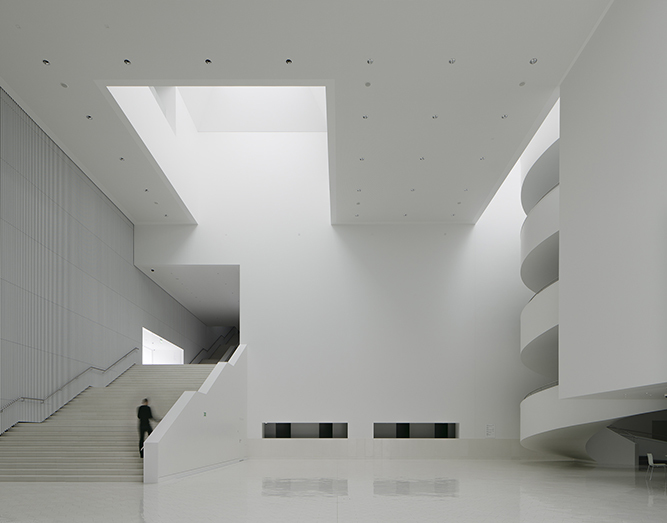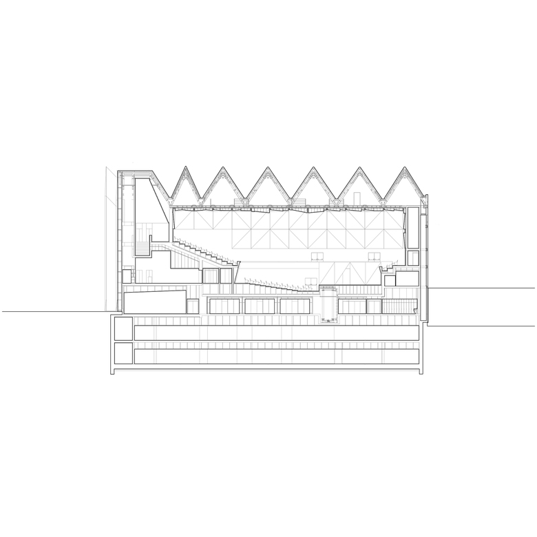 The expressive preeminence of the building, concentrated along its perimeter and the pattern that shapes its roof, results from the influence of some of Central Europe’s expressionist architecture. From the outside, the building is perceived as a weightless volume in which the glass facade—sometimes translucid, sometimes opaque—transmits expressive qualities depending on the building’s use. On the inside, the concentration of the service areas and communication elements along the perimeter creates a sensitive relationship of the building with the exterior while at the same time it delimits a large open space, set aside for the symphonic and chamber music halls to play their main roles.