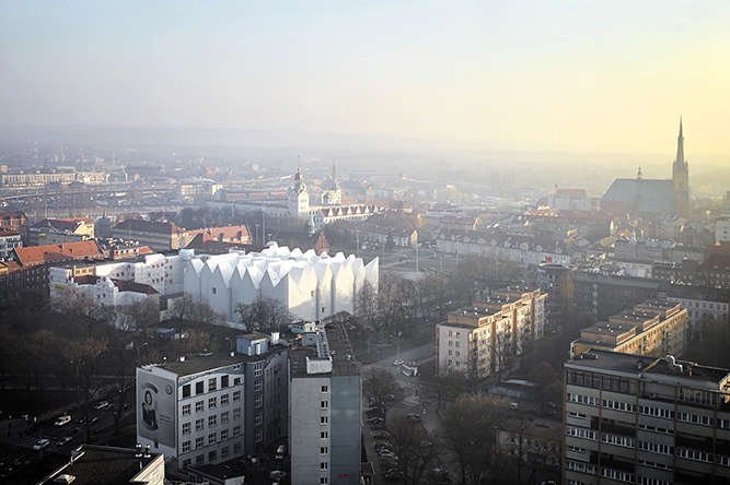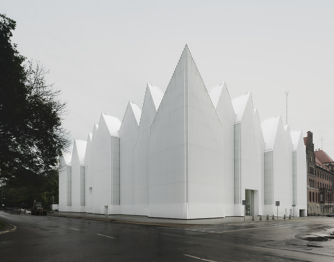 The Philharmonic Hall, which is to accommodate a concert hall and a chamber music hall, is a very complex building that occupies the same space as the former music building. This is a synthetic project that shares identifying traits with its surrounding context. Mass, verticality and the shape of the roofl ines are dominant, connecting the hall with the rest of the city.