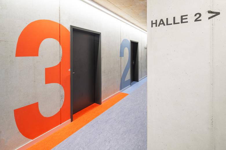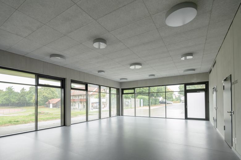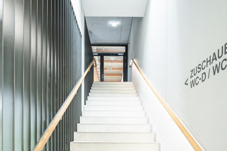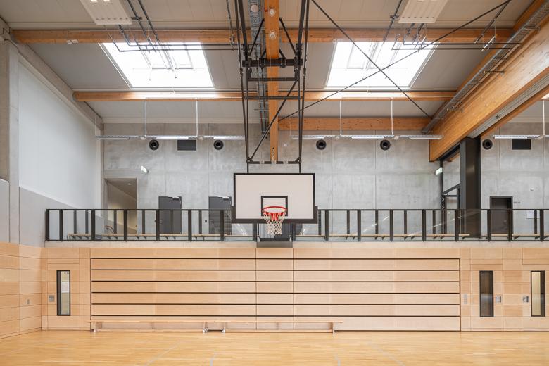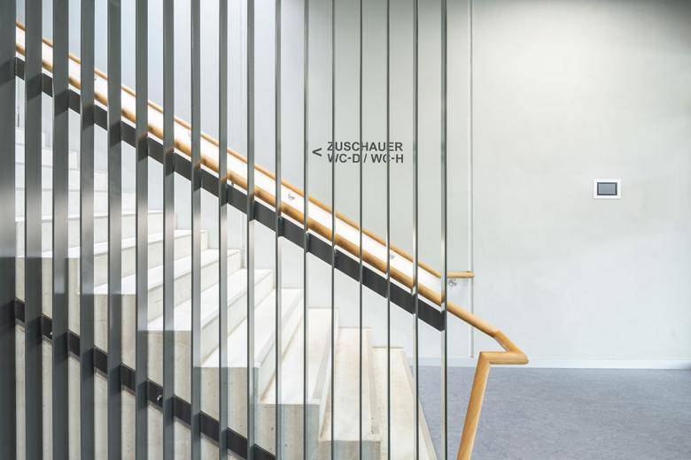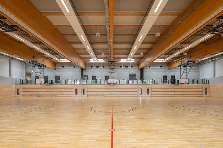 Die Besucherführung zu den Tribünenplätzen erfolgt konsequent über das Obergeschoss. Die 3-Fach-Sporthalle verfügt über drei getrennt voneinander funktionierende Einzelsportfelder. Bei Vollnutzung der Gesamthalle für Sportveranstaltungen ist eine mobile Tribüne für 500 Besucher vorhanden, die bei der Einzelnutzung der drei Einzelhallen eingefahren wird. Ein Mehrzweckraum für besondere Kleinsportvereine mit angeschlossener Ausgabeküche ist mit dem Besucherfoyer verbunden und kann durch eine mobile Trennwand das Foyer bei Veranstaltungen erweitern.