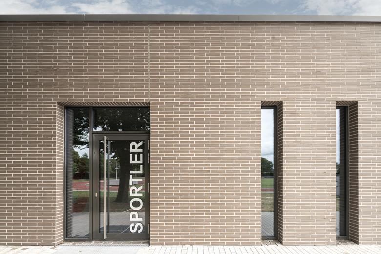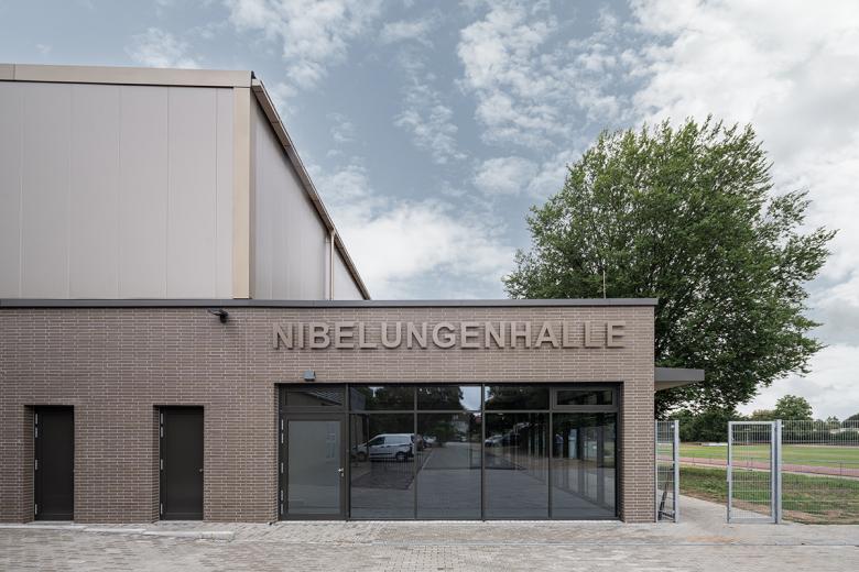 Östlich des Baugrundstücks schließt sich die rhythmisierte Nibelungenschule an, bestehend aus mehreren einstöckigen Gebäuden und einem langen zweistöckigen Riegelbau, die als Kulturdenkmal in Hessen eingetragen ist. Die Sporthalle, als städtebaulicher Endpunkt, ist auf Geländeniveau errichtet und wird von einstöckigen Nebenzonen auf zwei gegenüberliegenden Seiten gerahmt. Der seitliche Zugang ist bewusst von der Wohnbebauung abgewandt, und er ermöglicht den direkten Anschluss der Stadionsportler an die Umkleidebereiche. Es wurde eine klare Trennung zwischen Straßenschuh- und Turnschuhbereich umgesetzt.