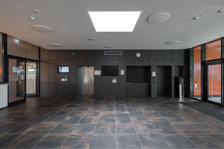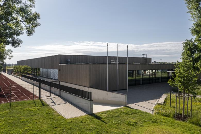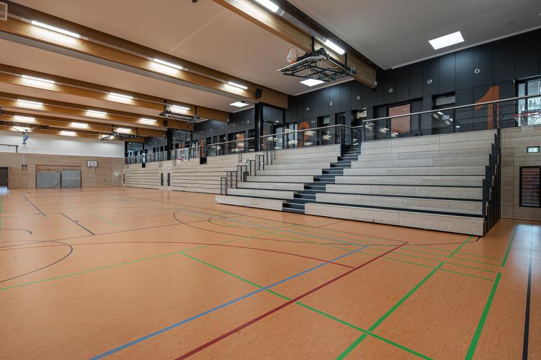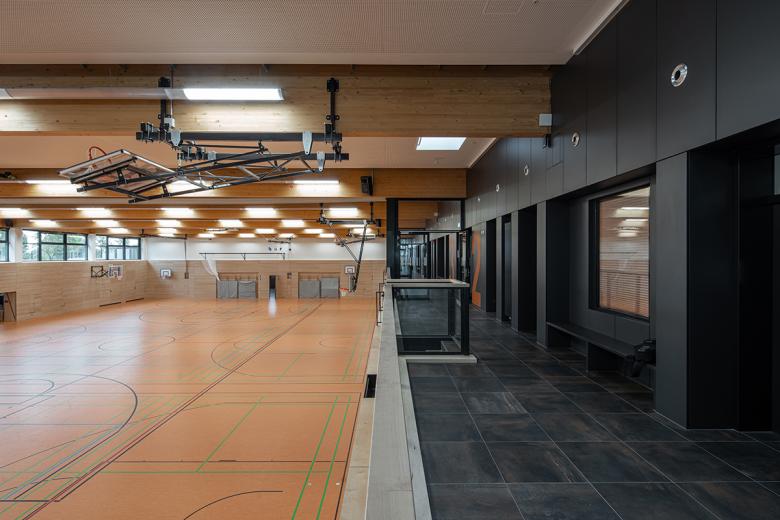 Der Neubau der 4-fach Sport- und Mehrzweckhalle ist zur Nutzung als Sportstätte und als Veranstaltungsort für 400 Personen realisiert worden. Der Hallenkörper des Neubaus ist in den Baugrund abgesenkt und fügt sich so harmonisch in die Umgebung ein. Im EG befinden sich neben dem einladenden Foyer als Herzstück Umkleideräume und eine kleine Küche mit Ausgabe. Über eine Treppe gelangt man in die wettbewerbsfähige Sporthalle mit ausziehbarer Tribüne, an die sich Technikräume, der Konditionsraum sowie ein Probenraum gliedern. Veranstaltungstechnik und Versorgungsgüter können ebenerdig über eine Rampe an der Nordfassade angeliefert werden. Der weitere Hallenteil ist autonom mit eigenem kleinen Foyer und Kiosk geplant und wird durch eine Wand abgeteilt, die jedoch zu einem späteren Zeitpunkt abgebrochen und durch einen Trennvorhang ersetzt werden könnte.