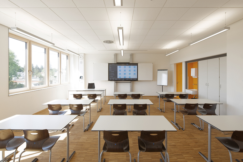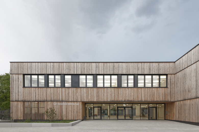 Der Neubau wurde für 22 Klassen mit ca. 420 Schülern mit den entsprechenden Fachklassen für Naturwissenschaften, Hauswirtschaft, Kunst und Werken sowie einer Ganztagesbetreuung realisiert. Im UG wurden die Technikräume, Lagerräume sowie die Fachklassen untergebracht. Im EG befinden sich der zentrale Eingangsbereich mit Aula, Musik- und Mehrzweckraum. Der Musikraum ist der Aula zuschaltbar. Zwischen den Klassenzimmern im OG sind beidseitig zugängliche Gruppenräume angeordnet. Ebenso im EG befinden sich Mensa und Ganztagesbetreuung sowie Verwaltung und Lehrerbereiche. Das Obergeschoss dient komplett den Klassenzimmern. Um das Motiv der benachbarten Grundschule aufzunehmen, wurde als Fassadenbekleidung eine senkrechte Holzverschalung vorgesehen, welche durch horizontale Fugen gegliedert wird. Das Motiv der Bandfenster wird wieder aufgenommen, um so einen harmonischen Gesamteindruck eines Campusgeländes zu schaffen.