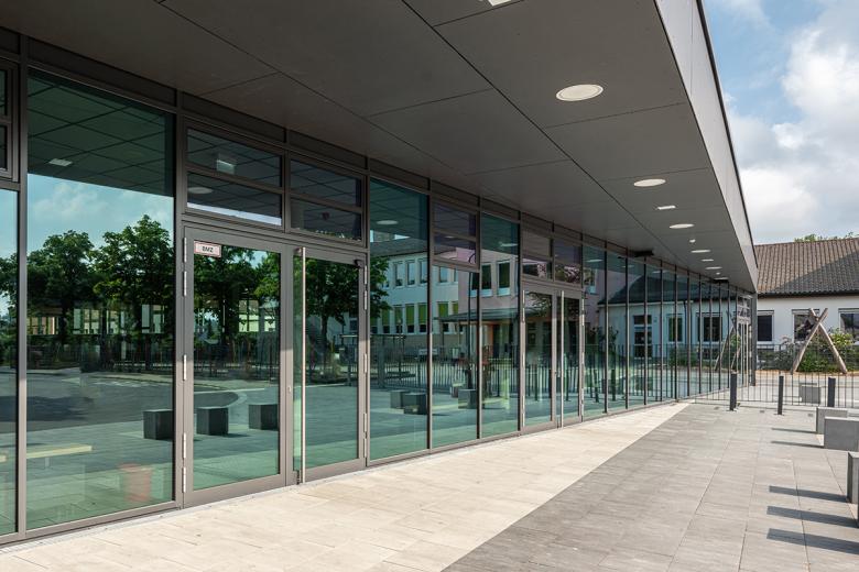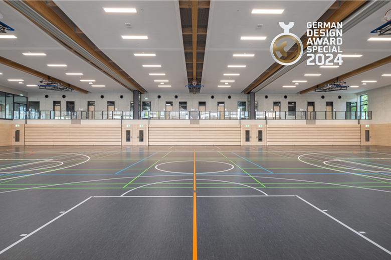 Der Neubau wurde als Dreifachsporthalle mit Mehrzwecknutzung, mit Schul- und Vereinssport in der Hauptnutzung und unterschiedliche Veranstaltungen mit bis zu 600 Sitzplätzen errichtet. Der Hallenkörper ist in den Baugrund eingegraben und durch die niedrige Traufkante der Entree- und Umkleidebereiche passt er sich in Art und Maß in die niedrige Bebauung der Schulumgebung ein und schafft in seiner Ausformung eine Willkommensgeste zum Buswendeplatz. Der zweiteilige Grundriss bildet die unterschiedlichen Funktionsbereiche des neuen Gebäudes ab. Westlich liegt der große Baukörper der Sporthalle, östlich die Entreezone und der südlich angegliederte Umkleidebereich. Über die Treppe im Foyer gelangt man in die Sporthalle, der unmittelbar die Geräte und Lagerräume, sowie die erforderlichen Technikflächen im Untergeschoss zugeordnet sind. Das Hallenniveau kann über zweiflüglige Türen in der Westfassade der Sporthalle angeliefert werden. Der Neubau wurde in Massivbauweise mit tragenden Wandscheiben und Stützen aus Beton ausgeführt.