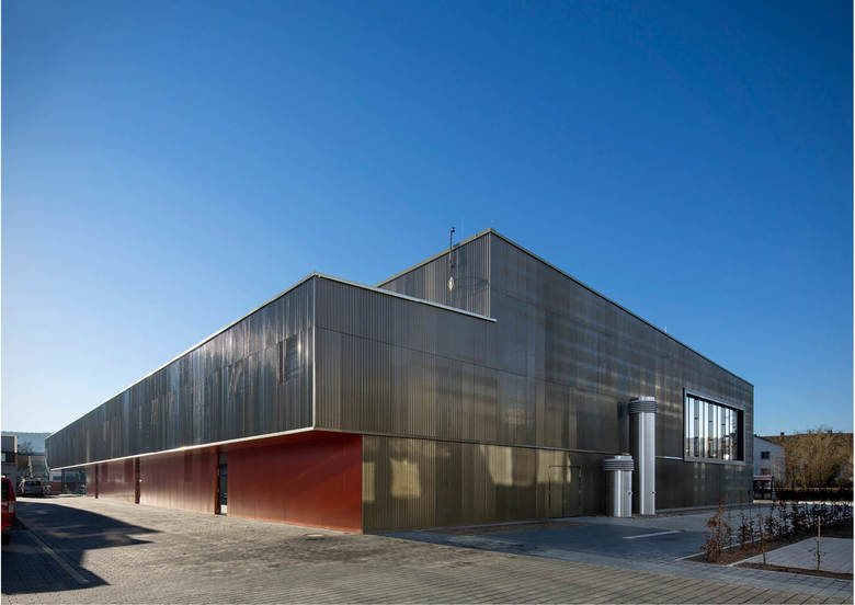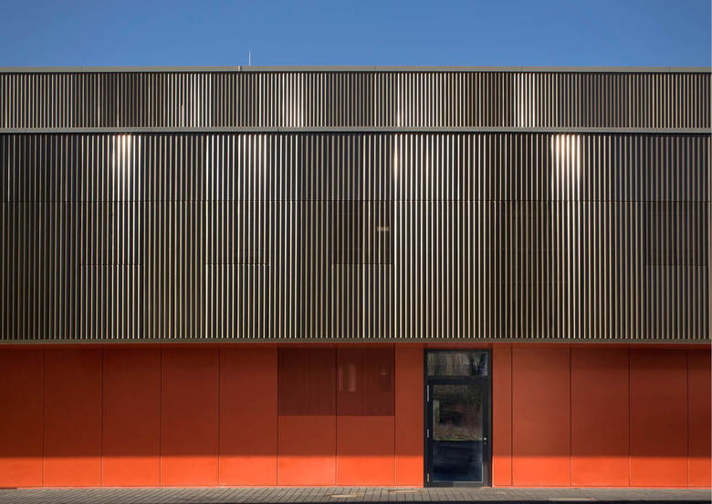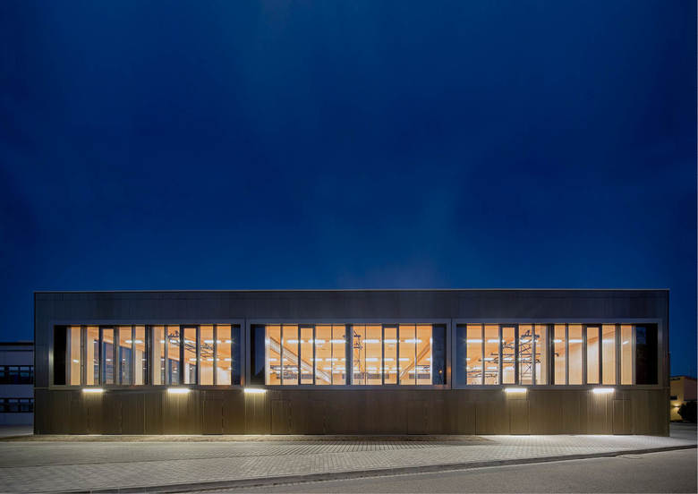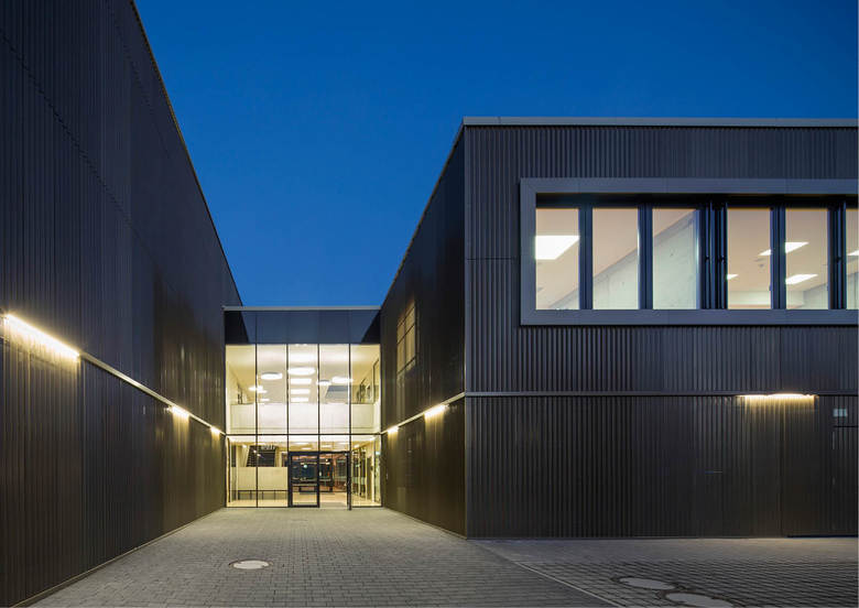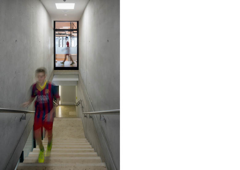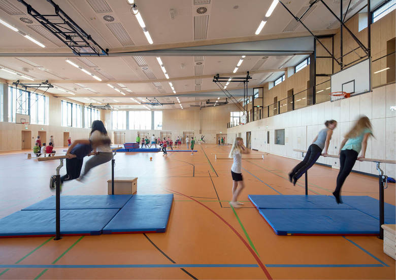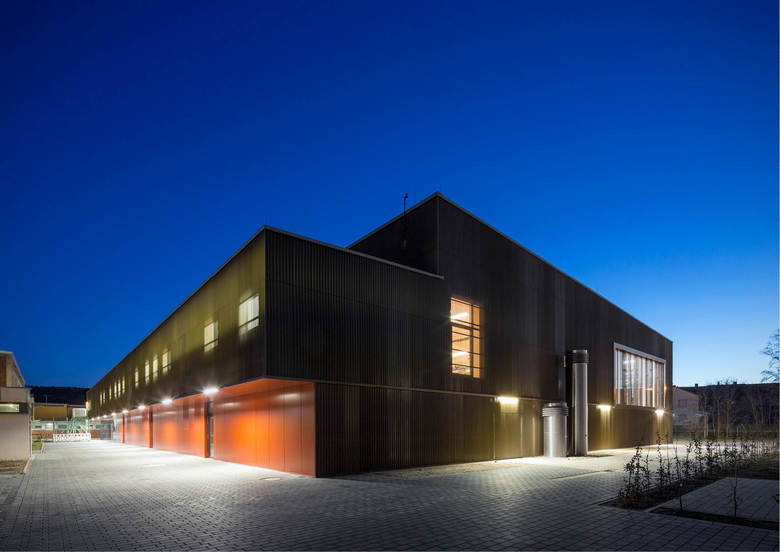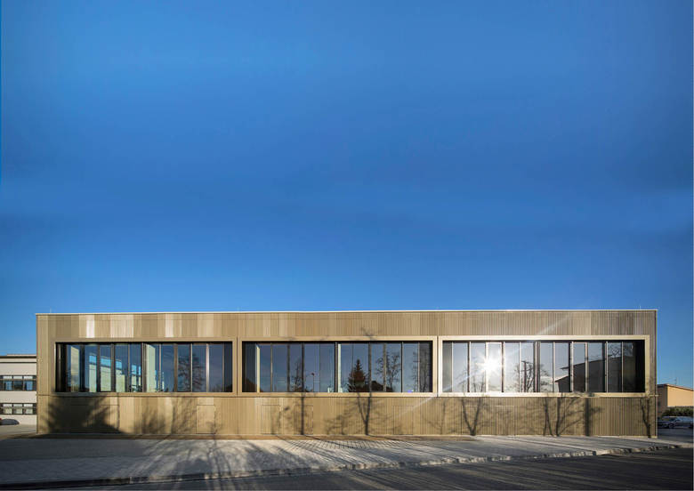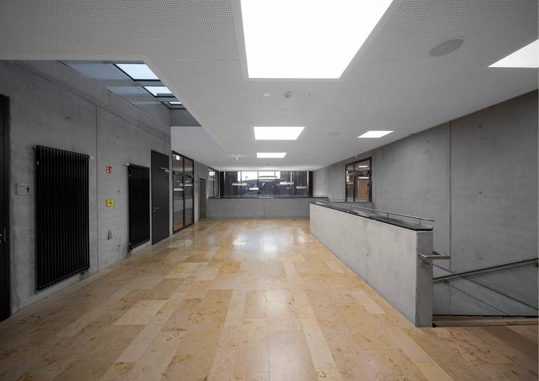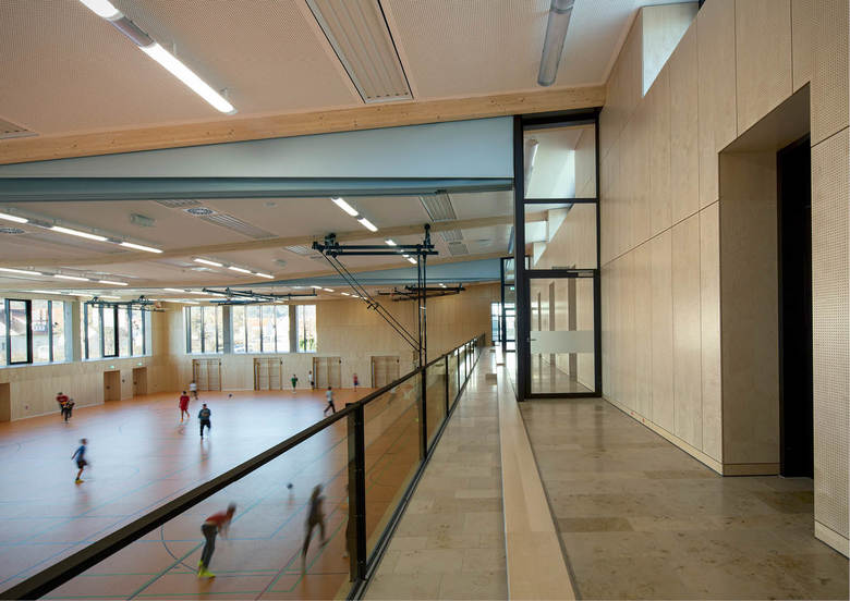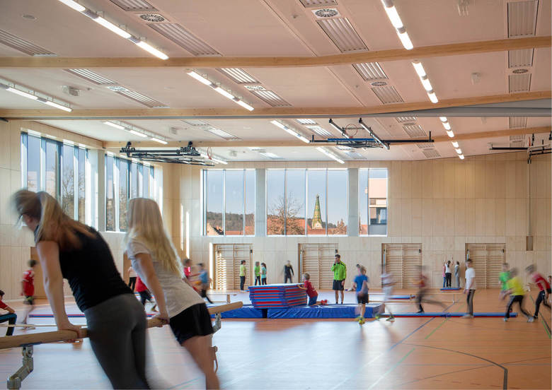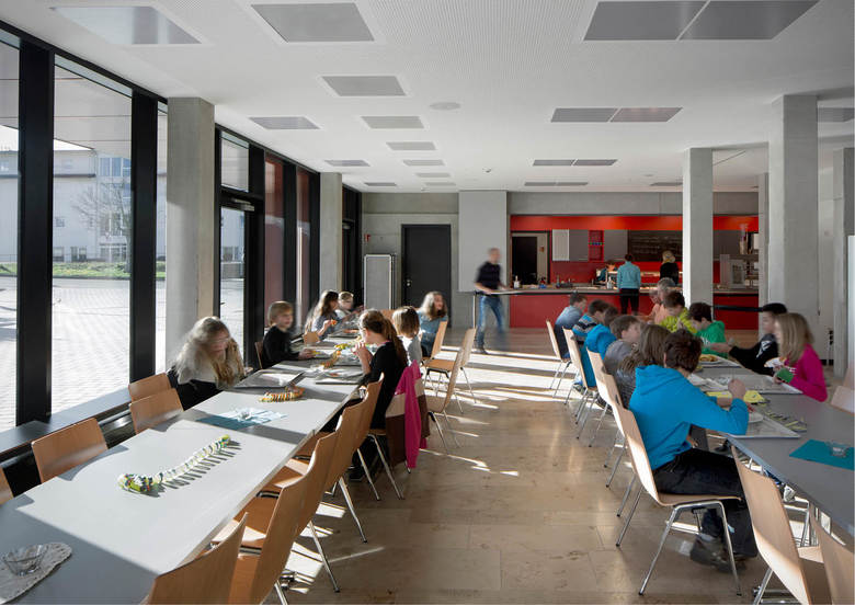 Der dreiteilige Grundriss bildet die unterschiedlichen Funktionsbereiche des neuen Gebäudes ab. Das angemessen großzügige Foyer dient als Zwischenglied und Vermittler. Von der rückseitigen Magistrale dient es als Haupterschließung von den Schulen. Zugleich öffnet es sich mit dezenter, aber eindeutiger Geste zur Straße und dient als (Neben-)Eingang für (abendliche) Veranstaltungen. Die Funktionszone der Turnhalle ist zweigeschossig und dient ganz dem Gedanken einer raumökonomischen und reibungslosen Erschließung. Der großzügig verglaste Speisesaal wird über das Foyer erschlossen und erhält einen überdeckten, zugeordneten Außenbereich zum Vorplatz der Realschule. Die gegeneinander versetzten Pultdächer reagieren auf die vorhandene, reich gegliederte Dachlandschaft des bestehenden Schulkomplexes. Durch den Versatz in den Dächern wird die Turnhalle über das Lichtband zusätzlich seitlich blendfrei von oben belichtet. Der Dreiklang aus Beton, Glas und Metall gibt dem Gebäude eine angemessen zeitgenössische Note, entspricht aber auch dem vorstädtisch-ländlichen Charakter des Ortes, der insbesondere für großvolumetrische Gebäude in der Vergangenheit oft verwendet wurde. Weitgehend durch dieses Material wird die Anmutung der Fassade geprägt, die sich mäandrierend um den maßstäblich gegliederten Baukörper legt.